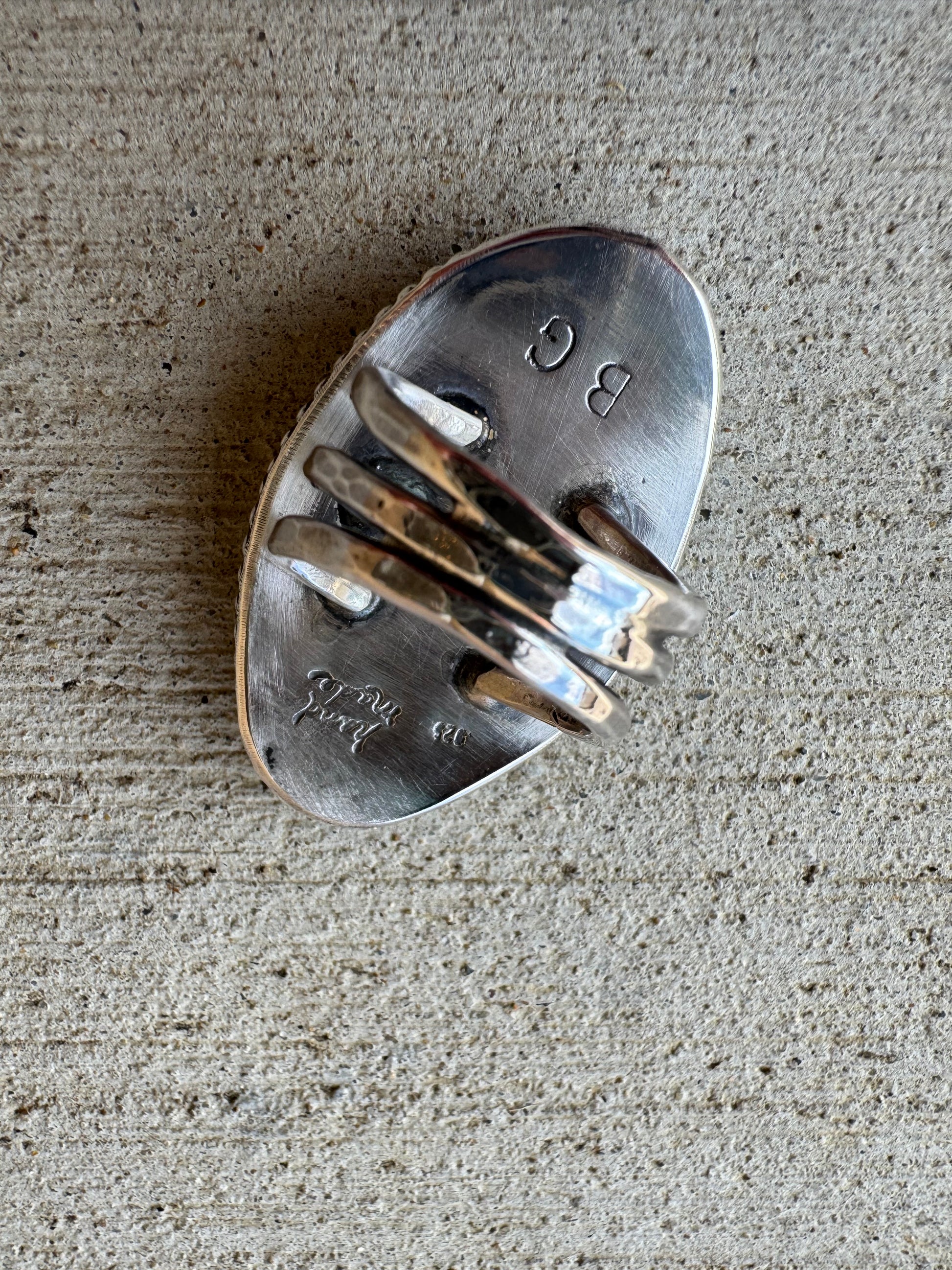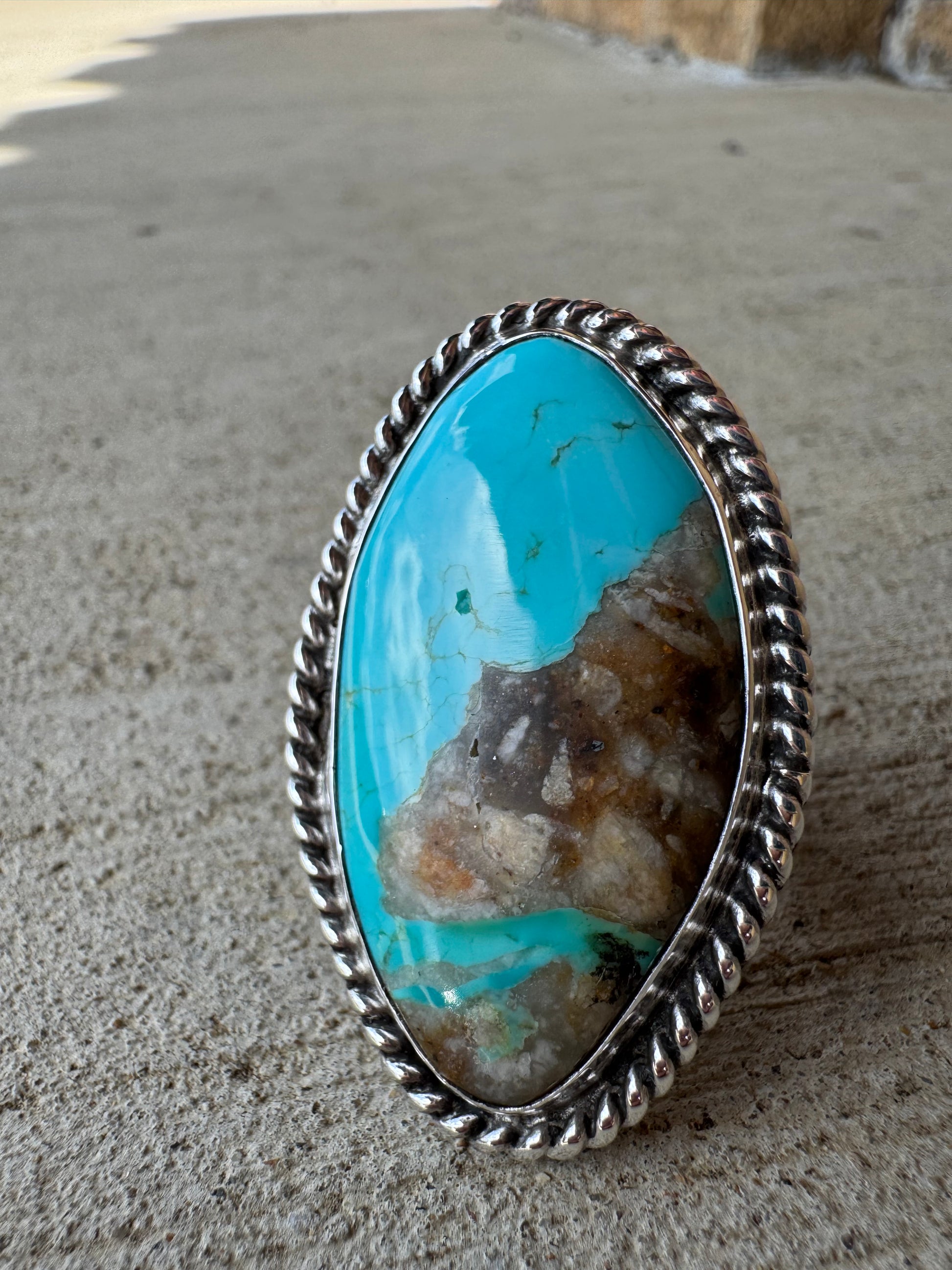 "Expertly crafted, this Kingman turquoise ring in size 8 showcases a stunning marquise shape and intricate twist wire detail. The three piece hammered shank adds a touch of elegance, while the sturdy sterling silver construction guarantees long-lasting wear. Stamped and signed for authenticity."