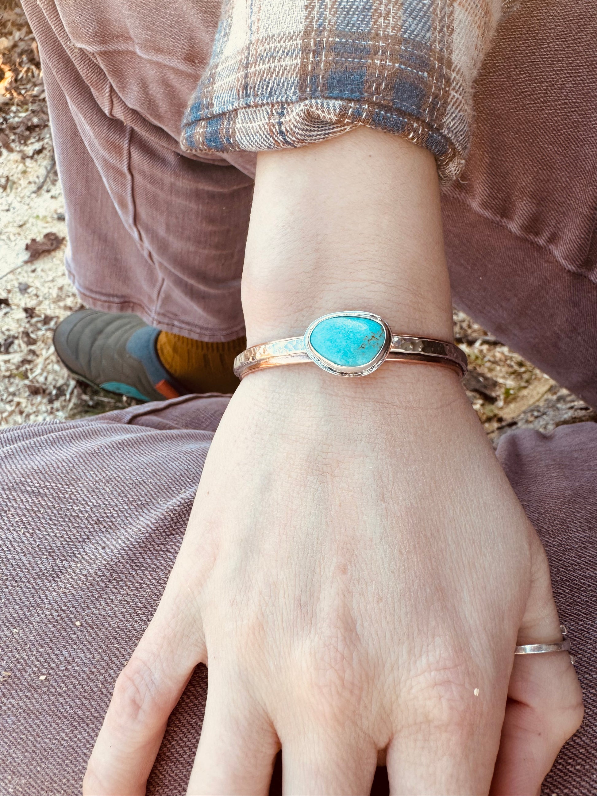 This bracelet is made with copper and sterling silver. The bracelet measures approximately 6 inches end to end. It fits a medium sized wrist. The turquoise is a light blue.