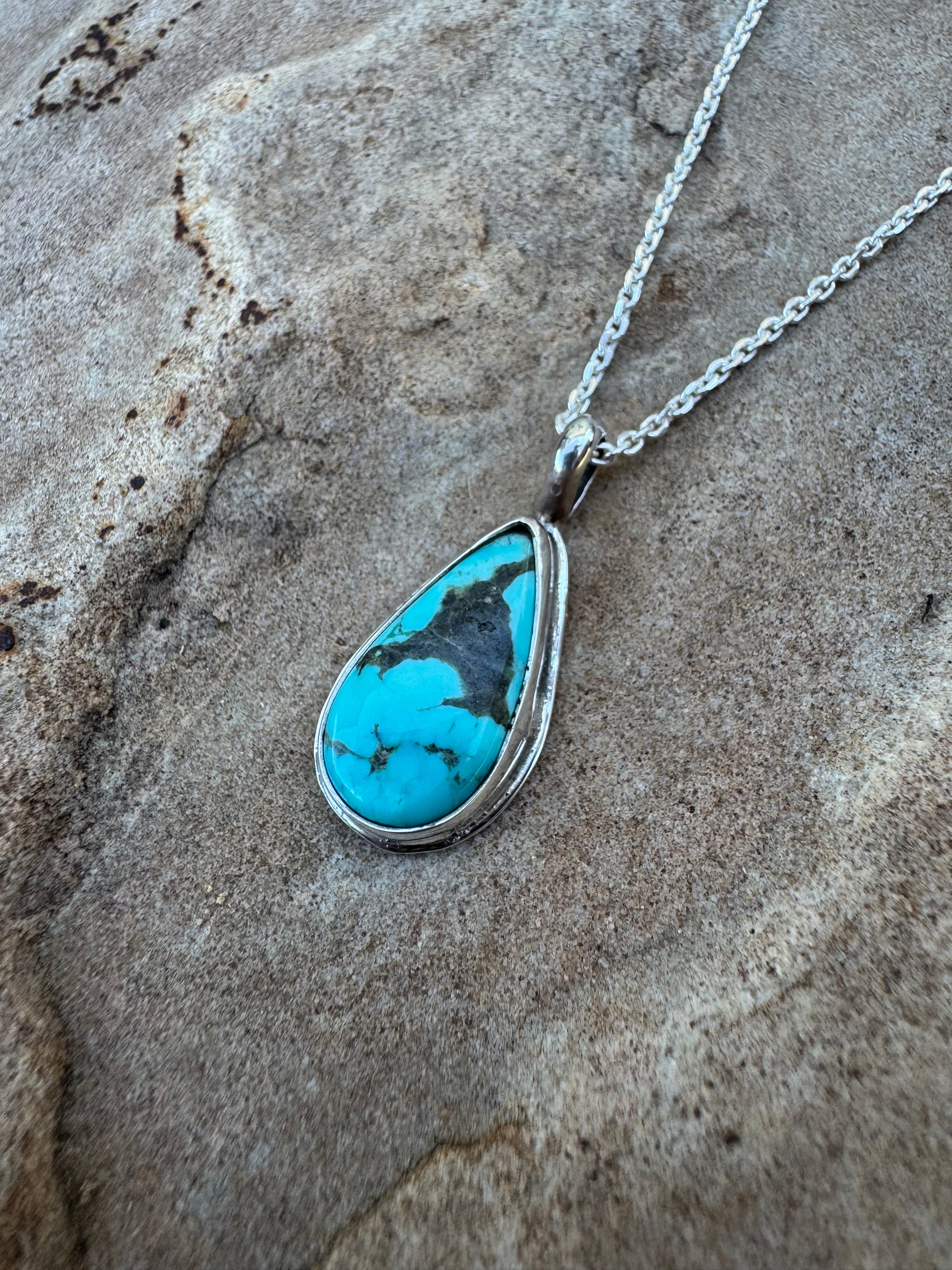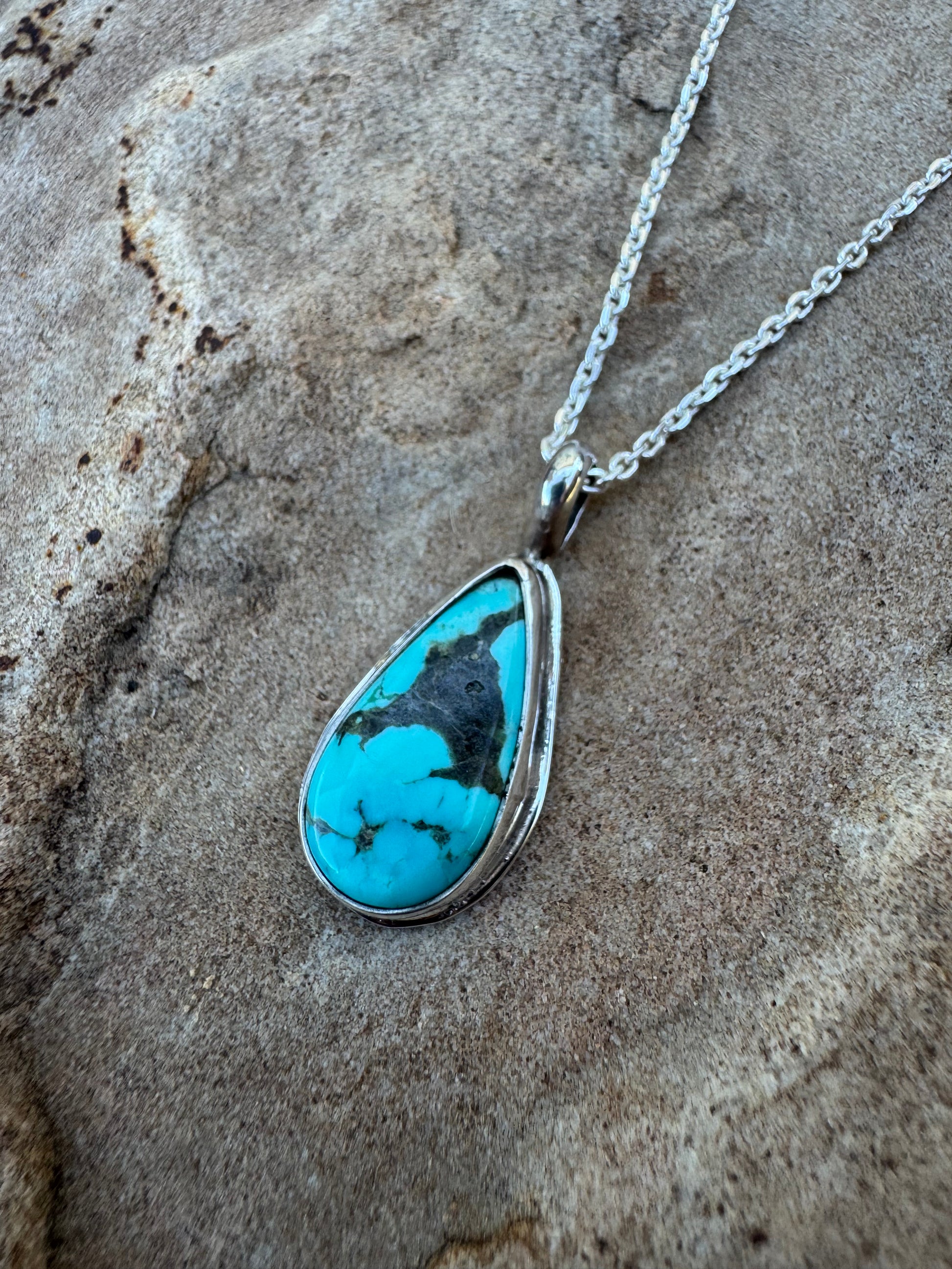 Indulge in the elegance and beauty of our Dainty Tyrone Turquoise Pendant! The tear drop shape is highlighted by the bold and bright blue color, adorned with a striking charcoal grey matrix. Crafted with sterling silver, it comes with a 16 inch chain. Elevate any outfit with this eye-catching accessory!