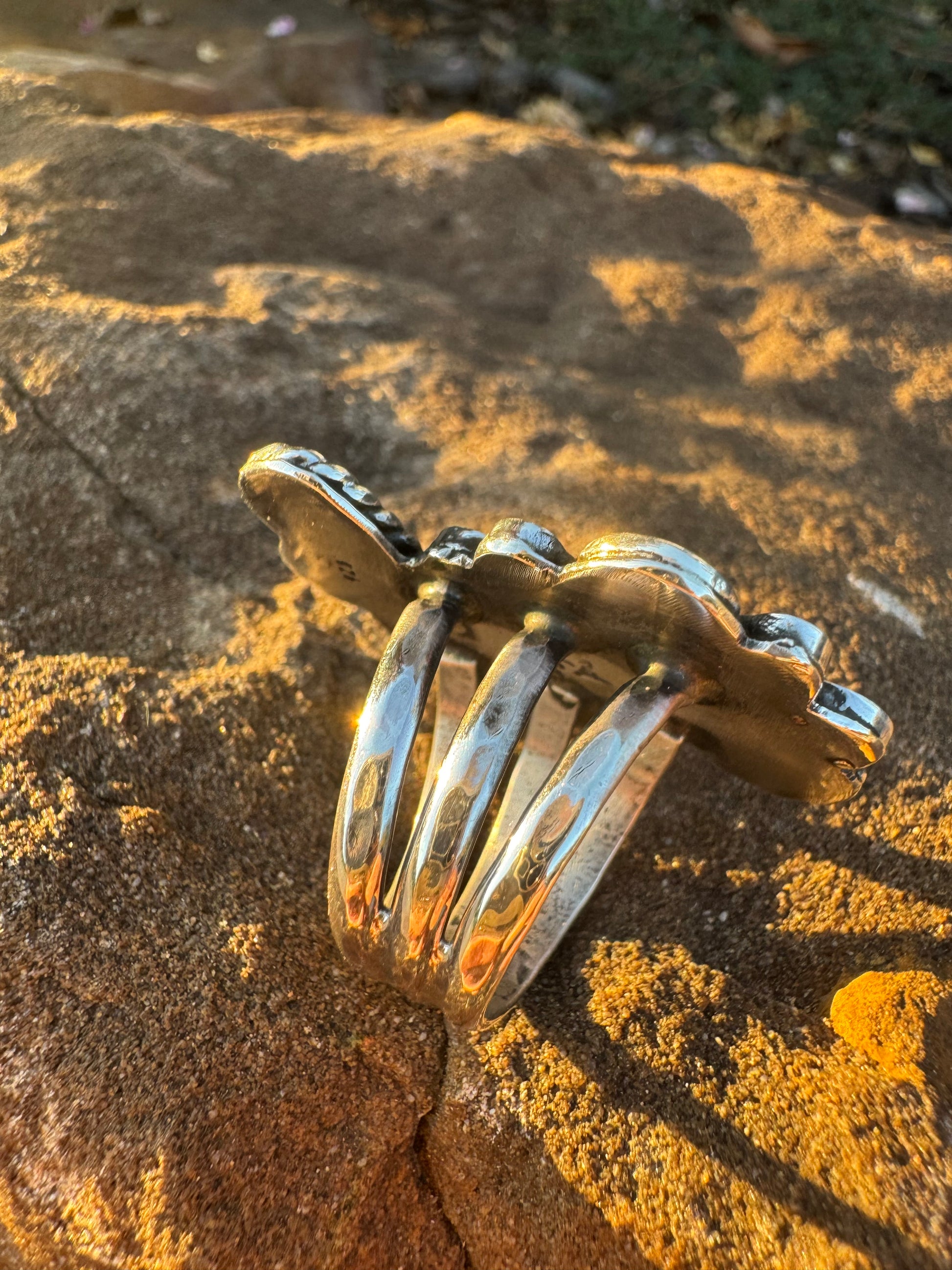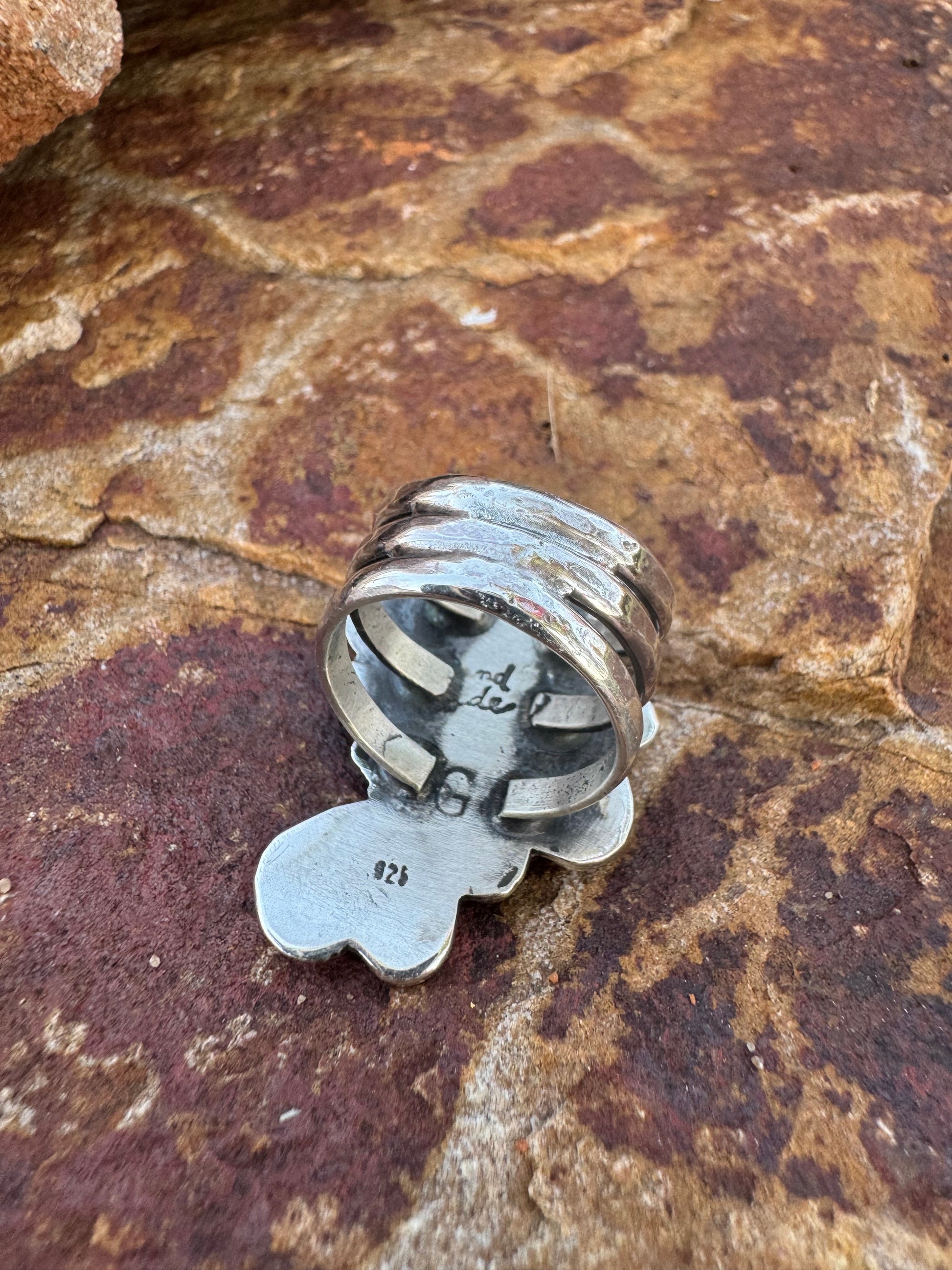 This stunning statement ring features an asymmetrical design with 4 small Kingman turquoise stones and a larger greenish blue Sonoran Gold turquoise stone. The hammered finish on the shank adds texture and the three-piece, wider band offers a comfortable fit. Can be stretched up to one size larger if needed.