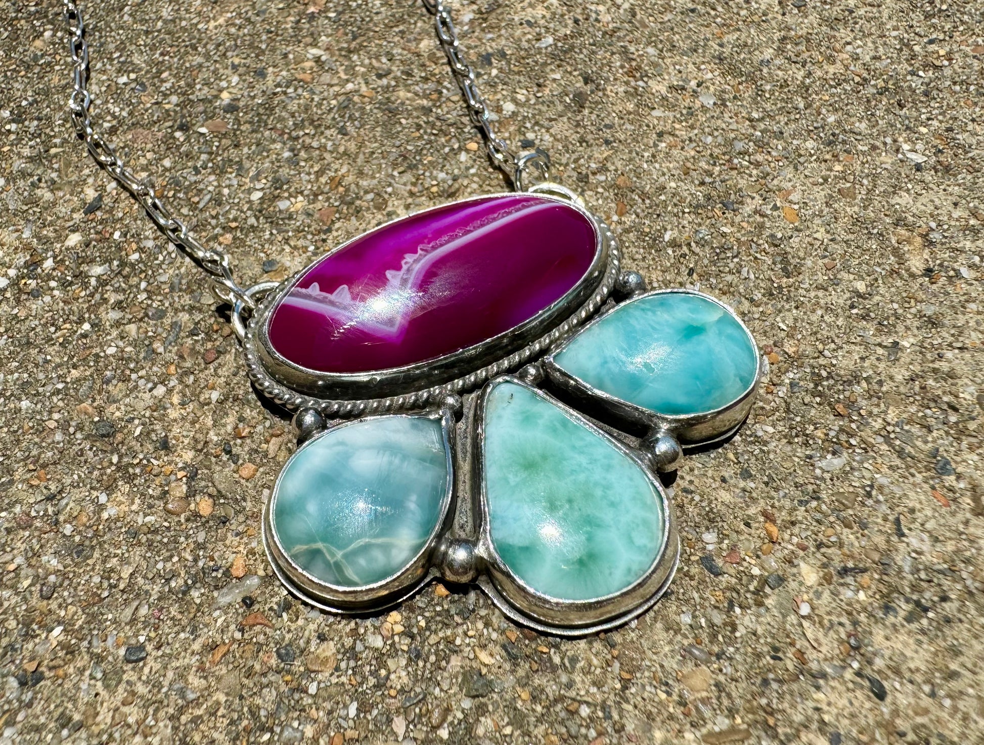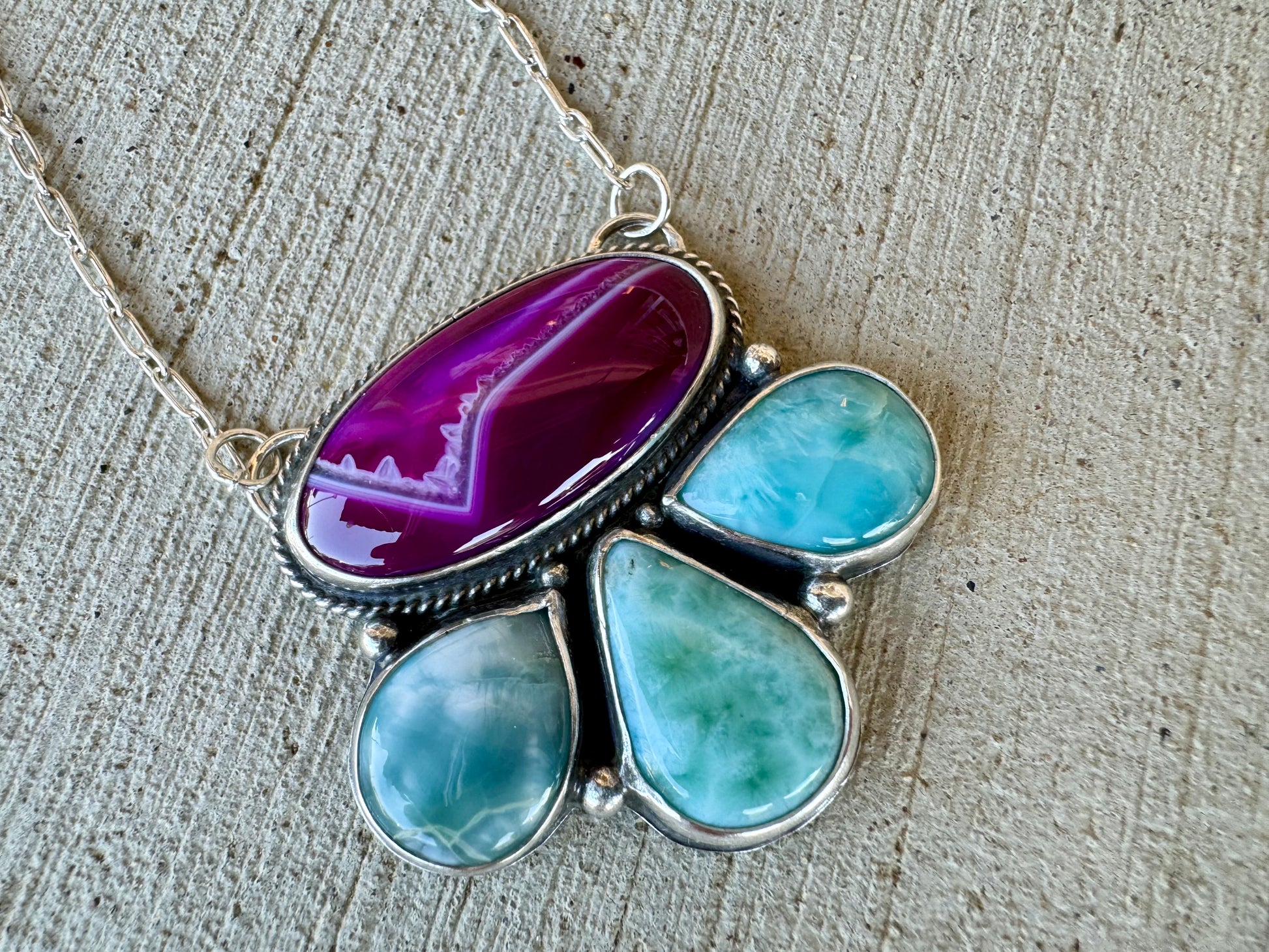 I was so excited to make this fun piece! It’s a mix of purplish/pink agate and blue larimar stones. Larimar is only found in the Dominican Republic. The floral design is very flattering when worn. The chain is approx 17.5 inches long.
