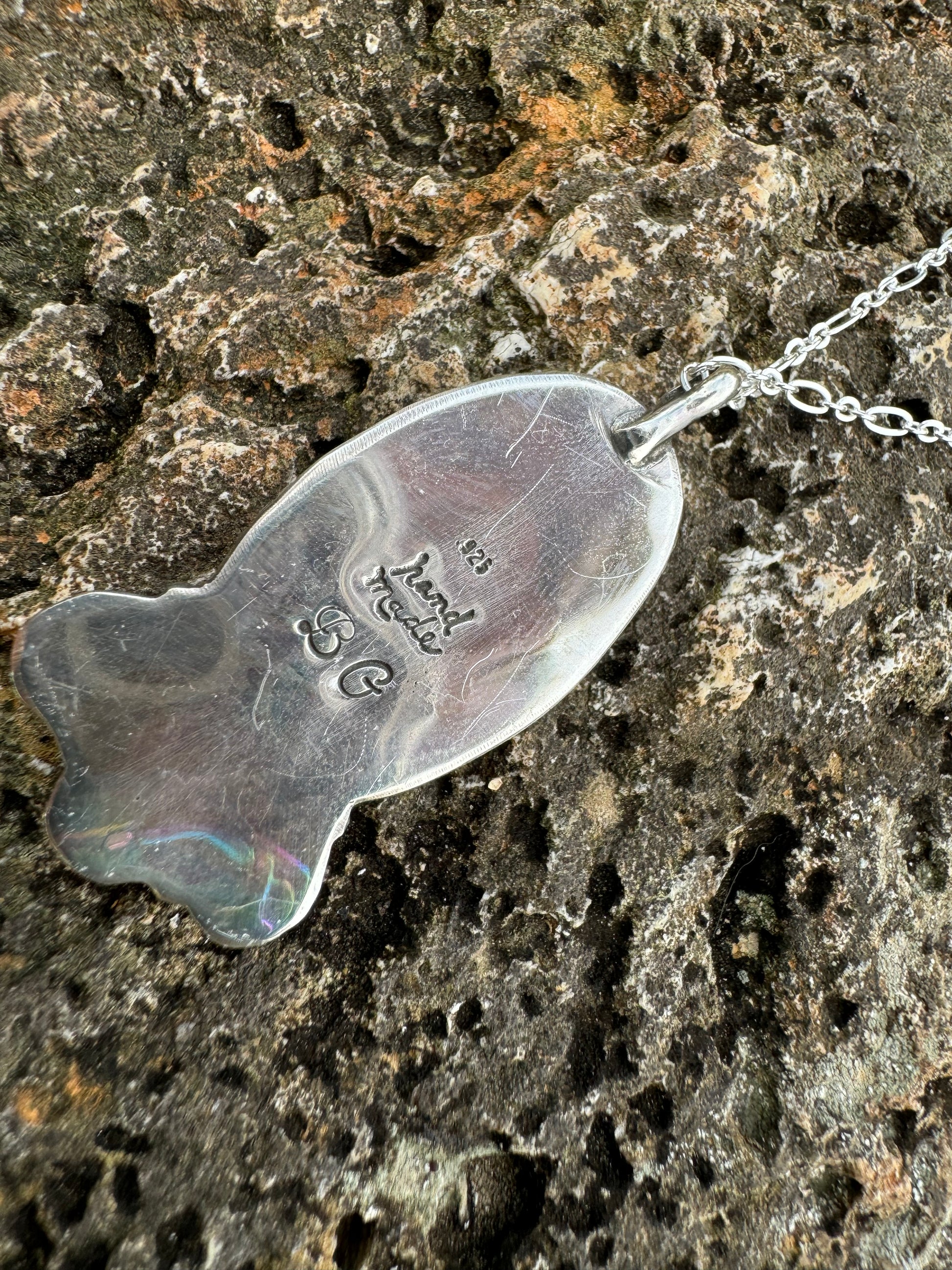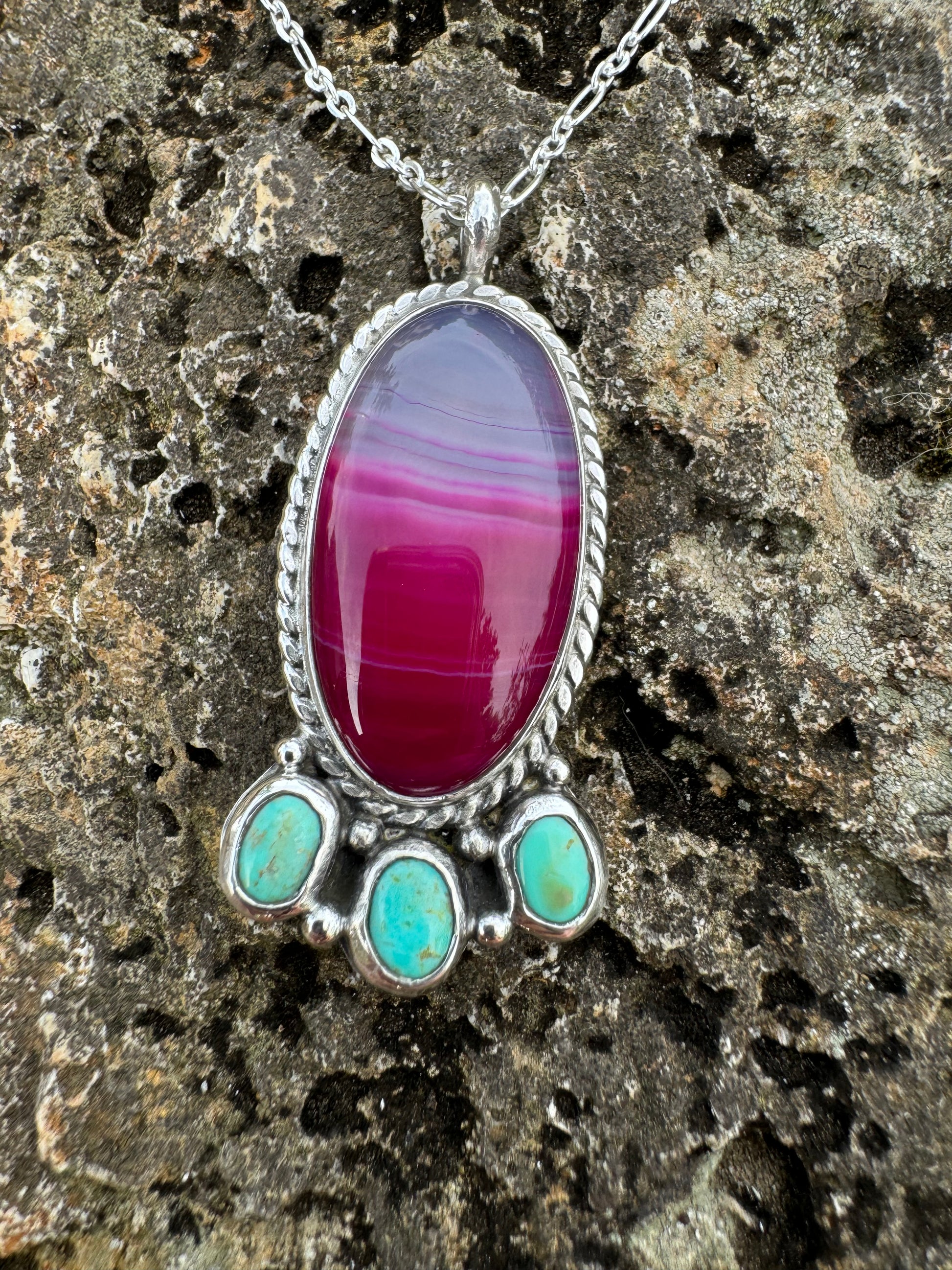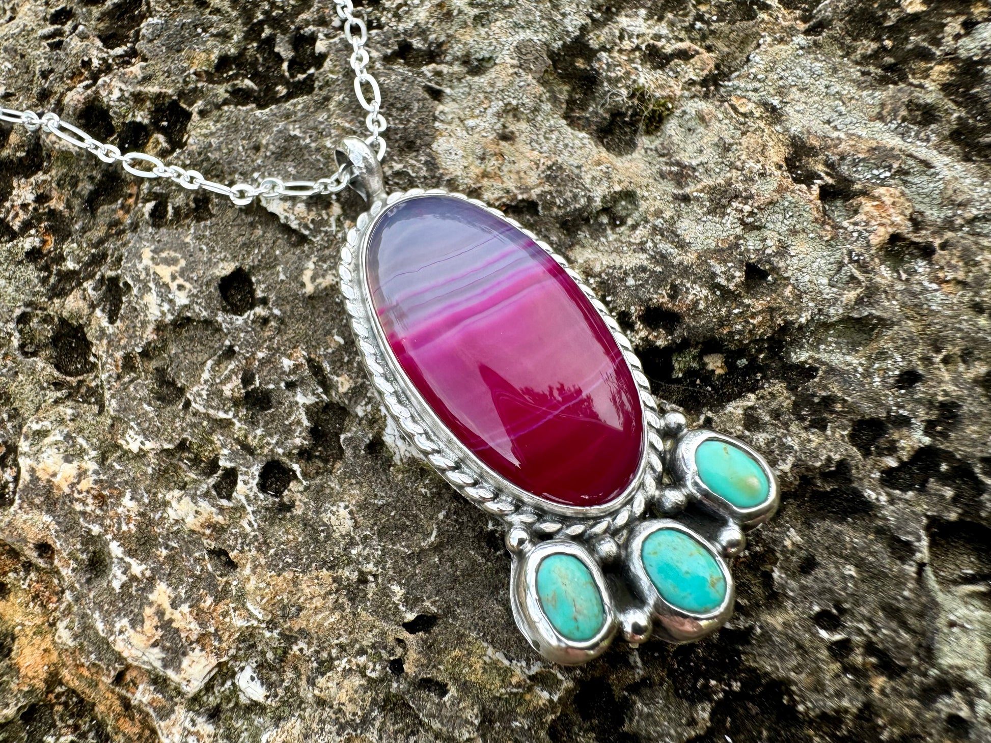 This piece is made with a beautiful ombré agate that fades from a translucent white to a vivid bright fuchsia pink color! The smaller stones are authentic Kingman turquoise . The piece is on a 18 inch sterling silver chain. This piece is so beautiful in person and would be so fun to wear with bright summer colors !