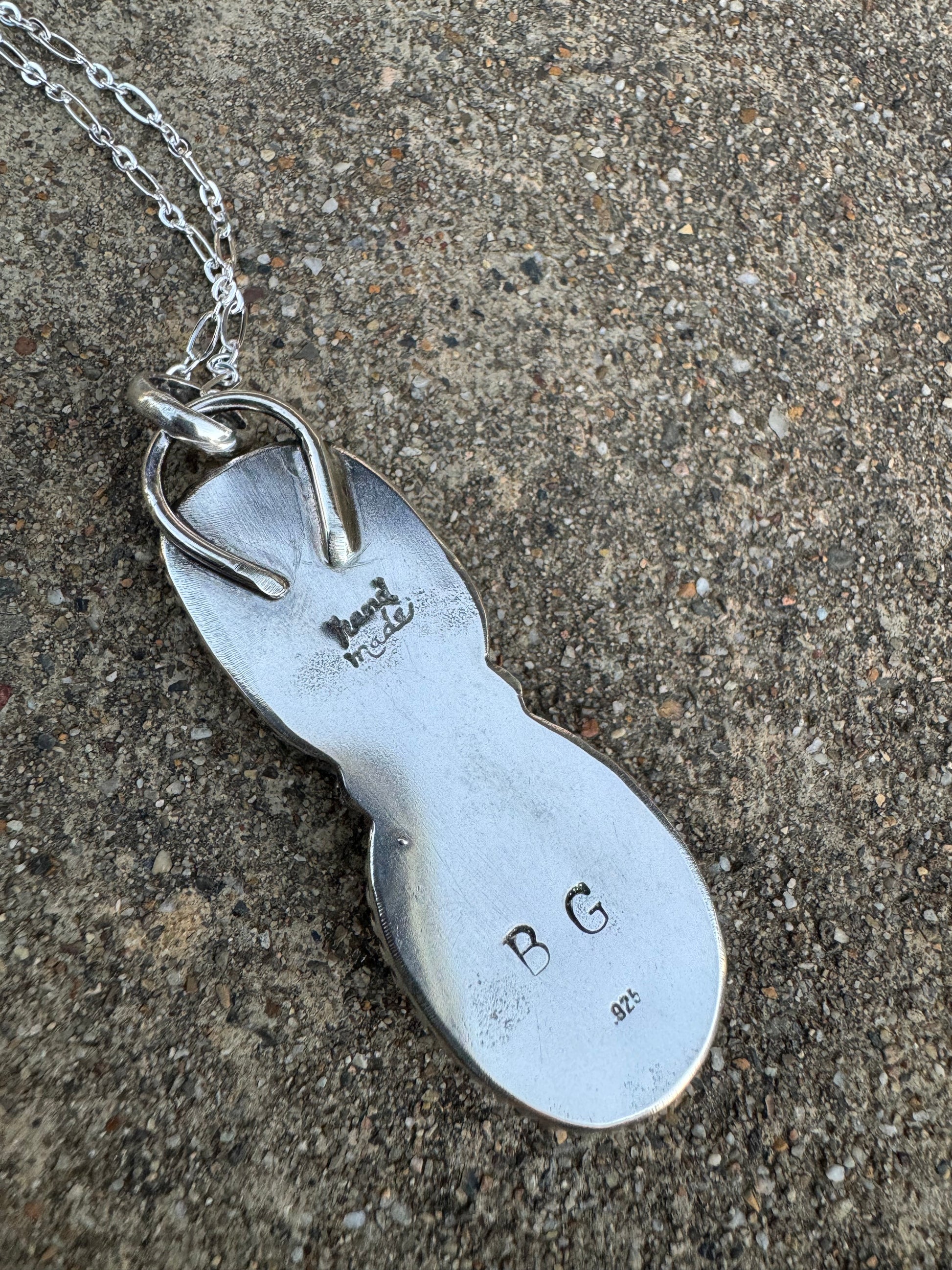 This piece is so bright and happy. The bright pinkish purple stone is made from durable and glossy agate. It is paired with a beautiful bright blue piece of Kingman turquoise. The combo is so fun! The chain is 20 inches long. All sterling silver and one of a kind.