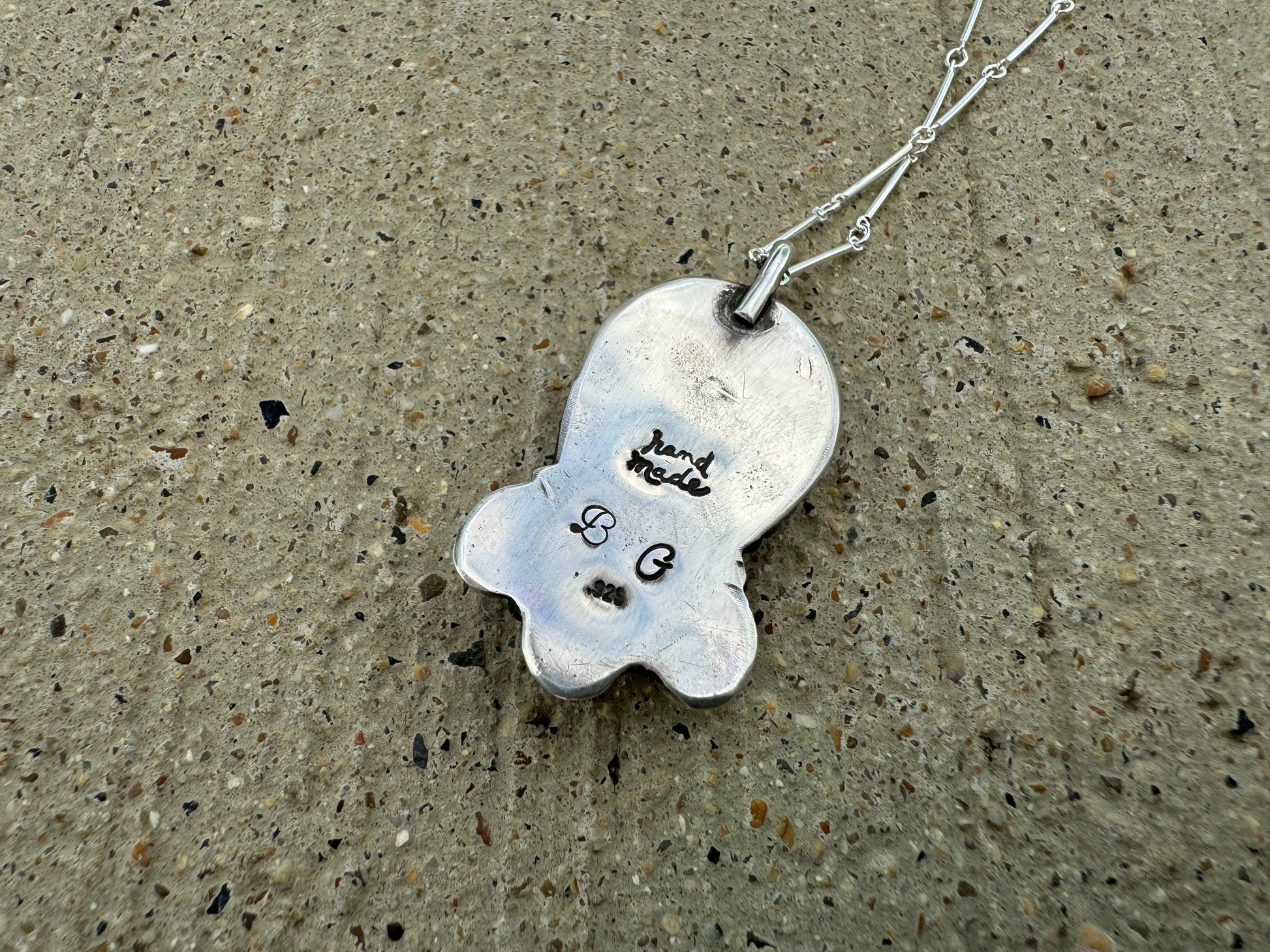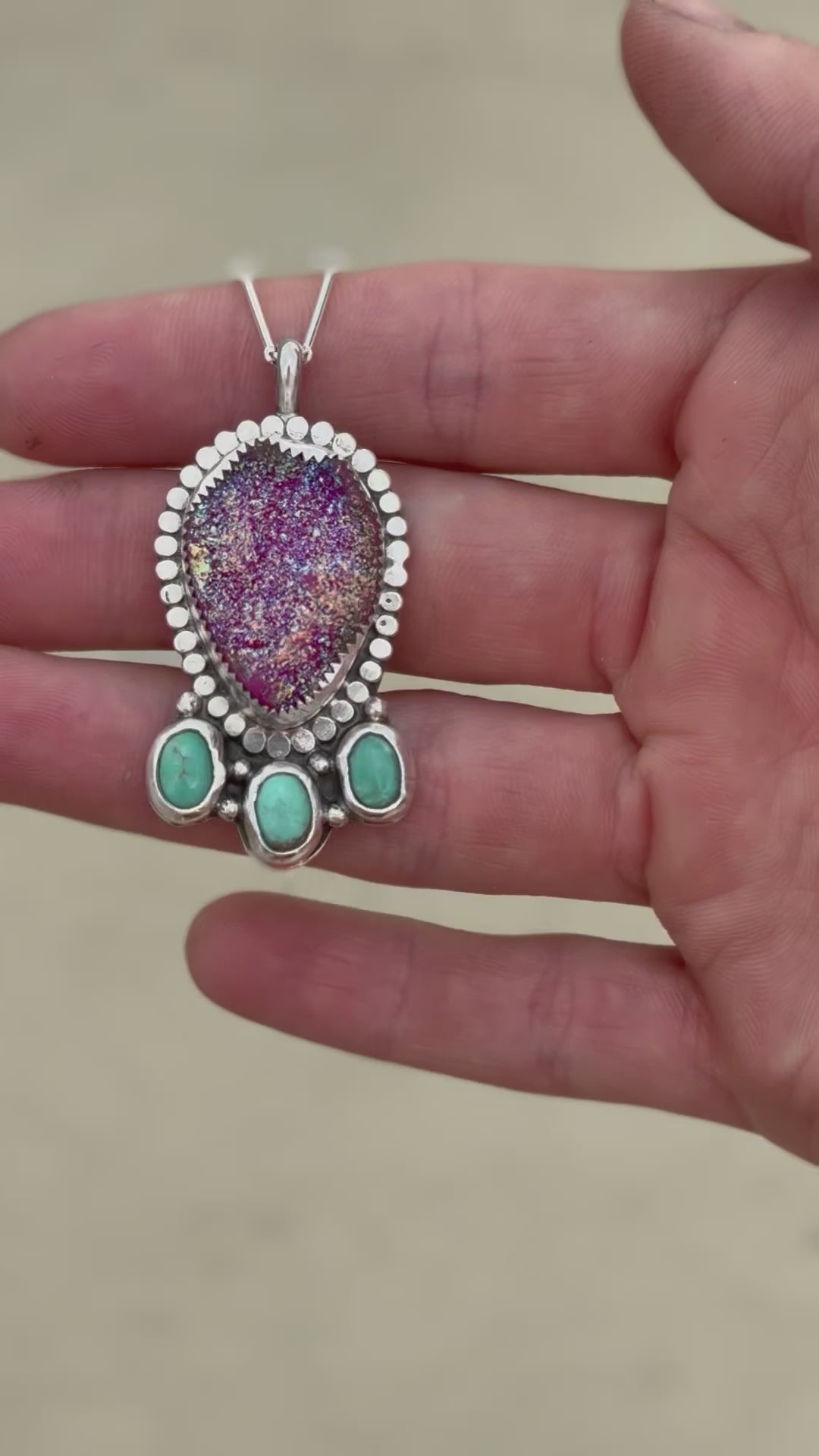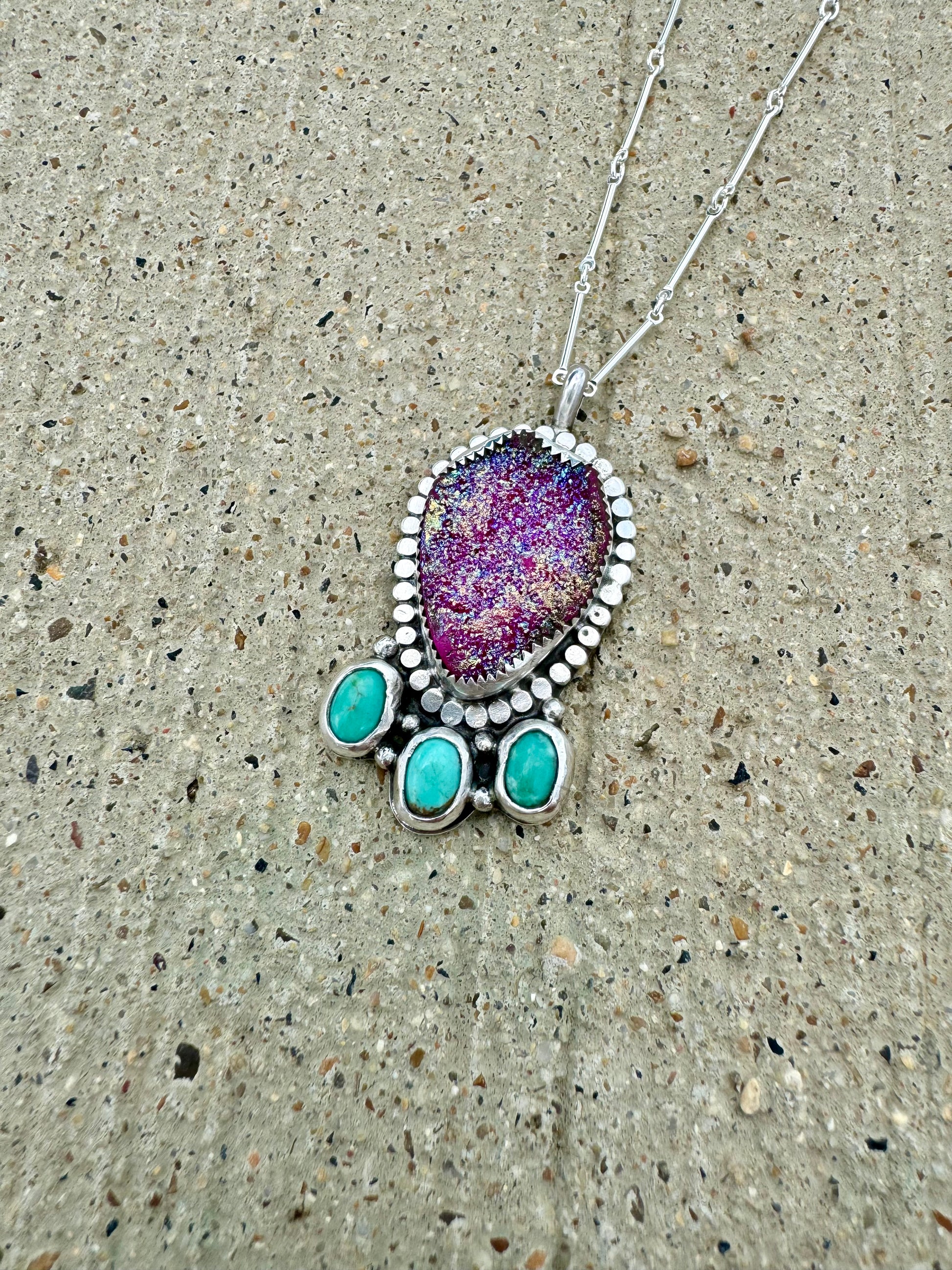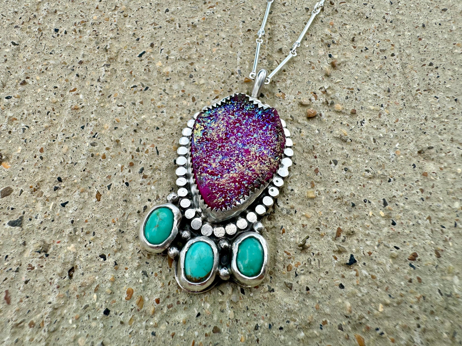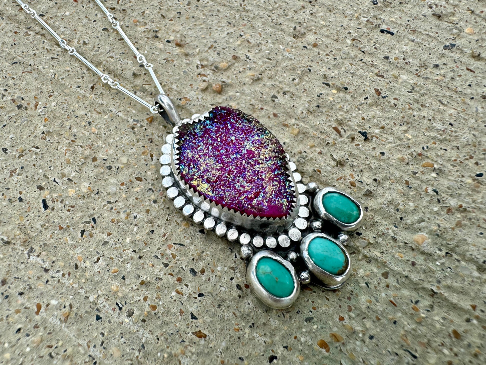 This piece is made with an iridescent agate that has a lot of tiny crystals all over the surface. This is known as a druse. The smaller stones are made of Kingman turquoise from Arizona . The chain is 16 inches long.