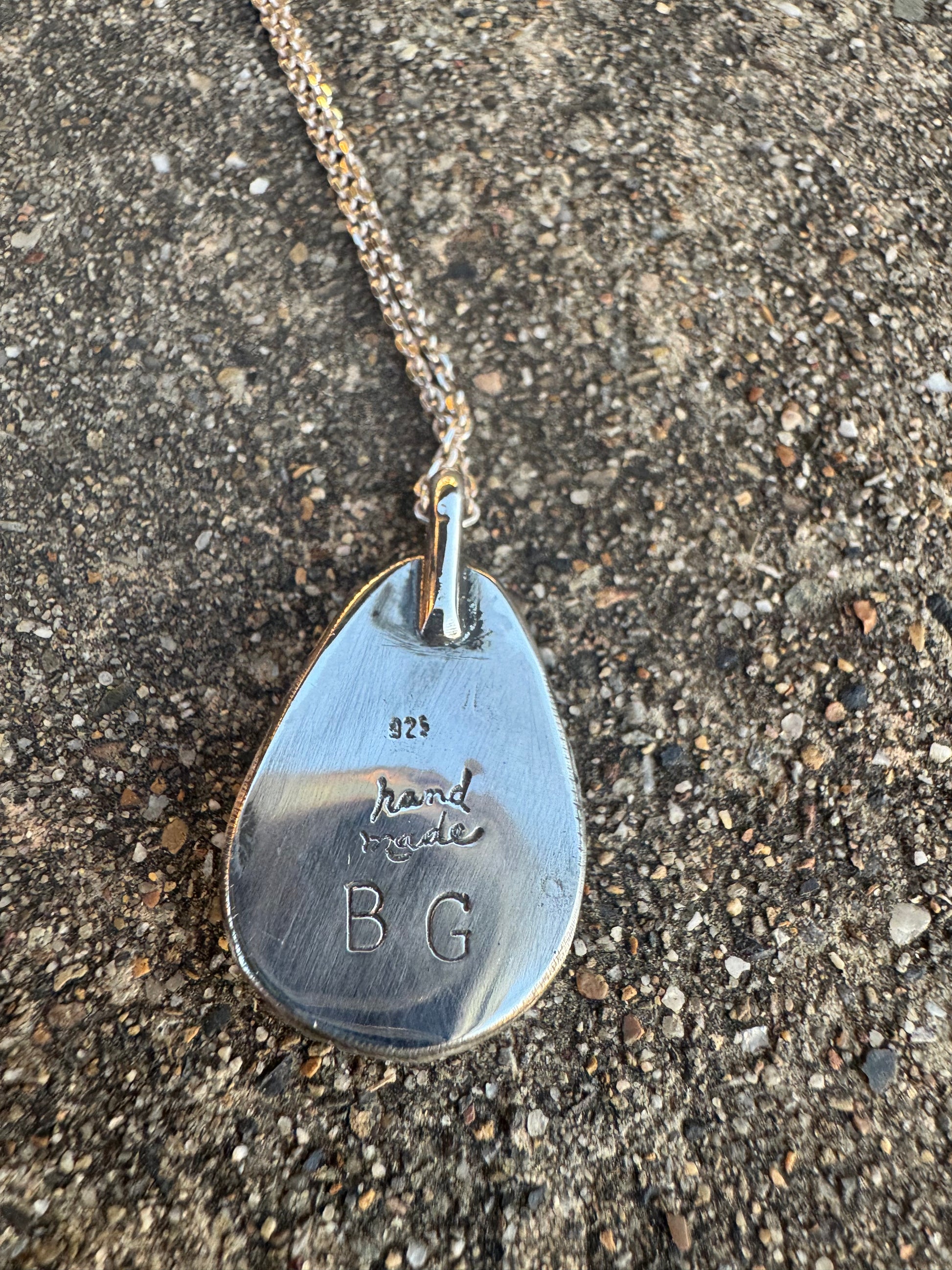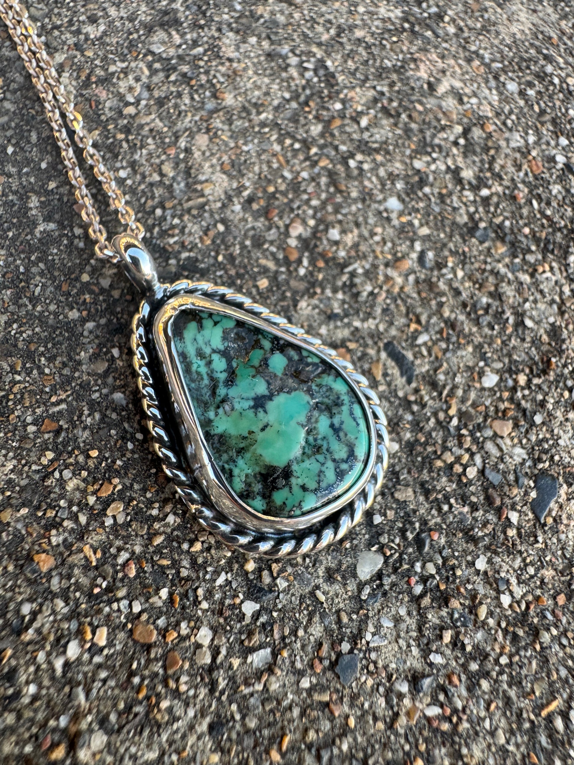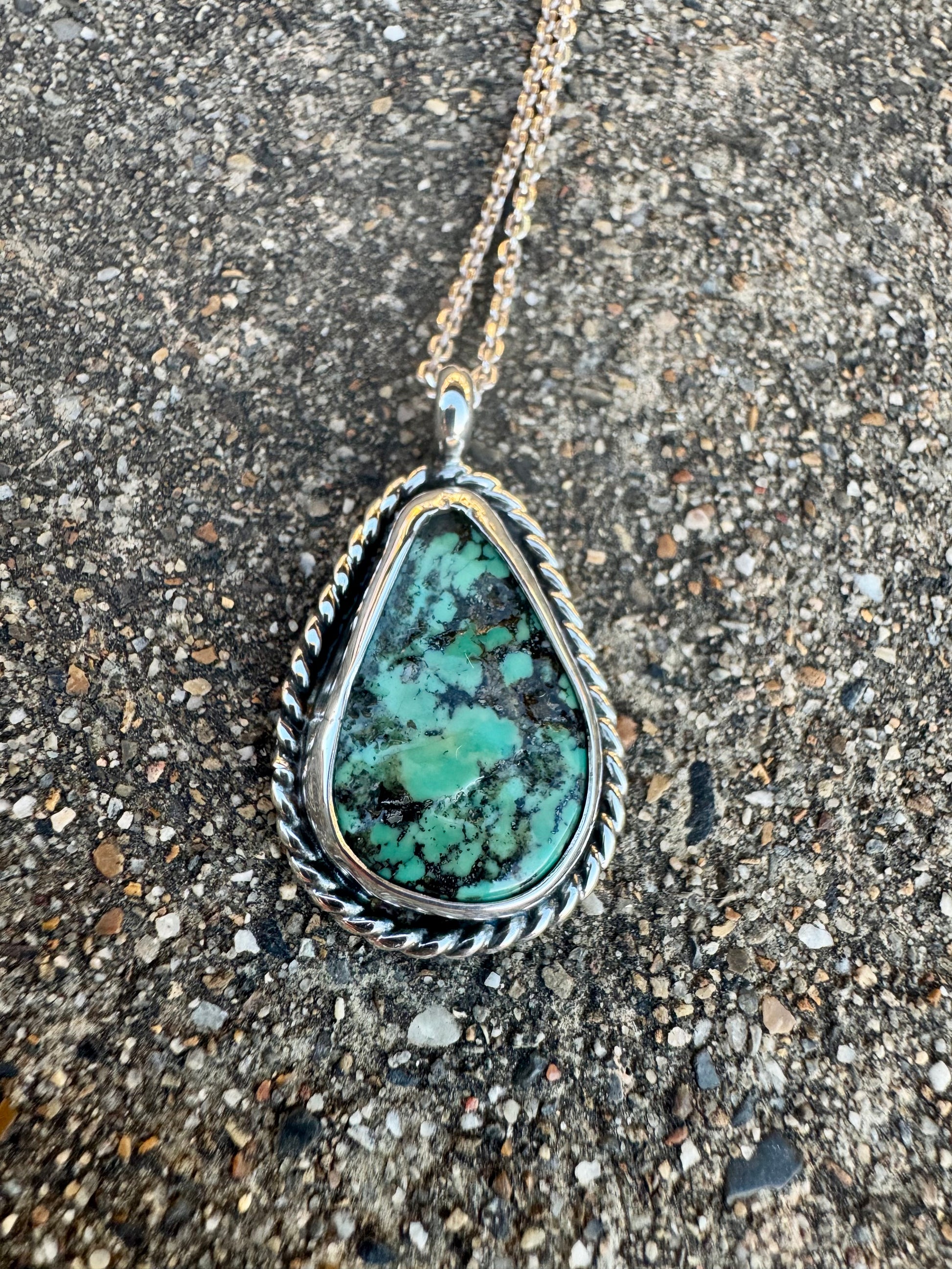 Expertly crafted and hand-picked, the Green Kingman Turquoise Pendant exudes a rustic charm with its distinctive black veining. Made with all sterling silver and featuring a 16 inch chain, this pendant is a statement piece that brings a touch of natural beauty to any outfit.
