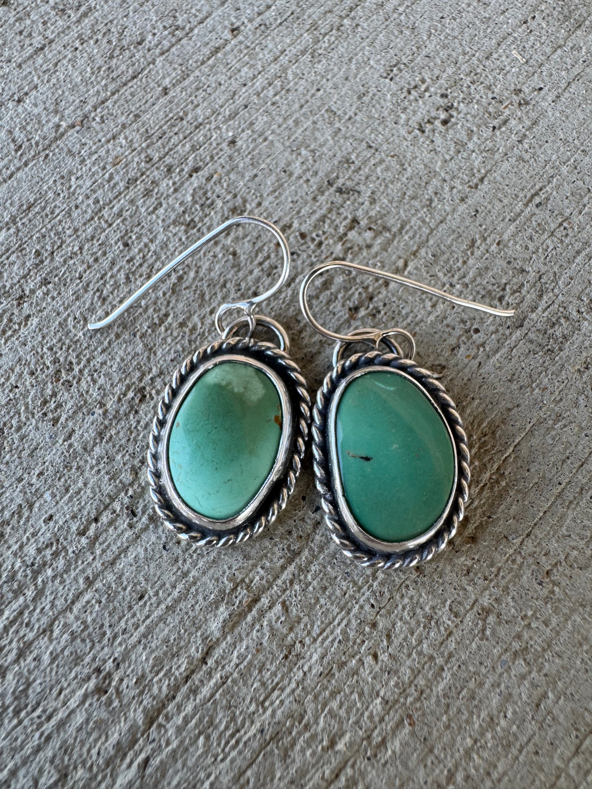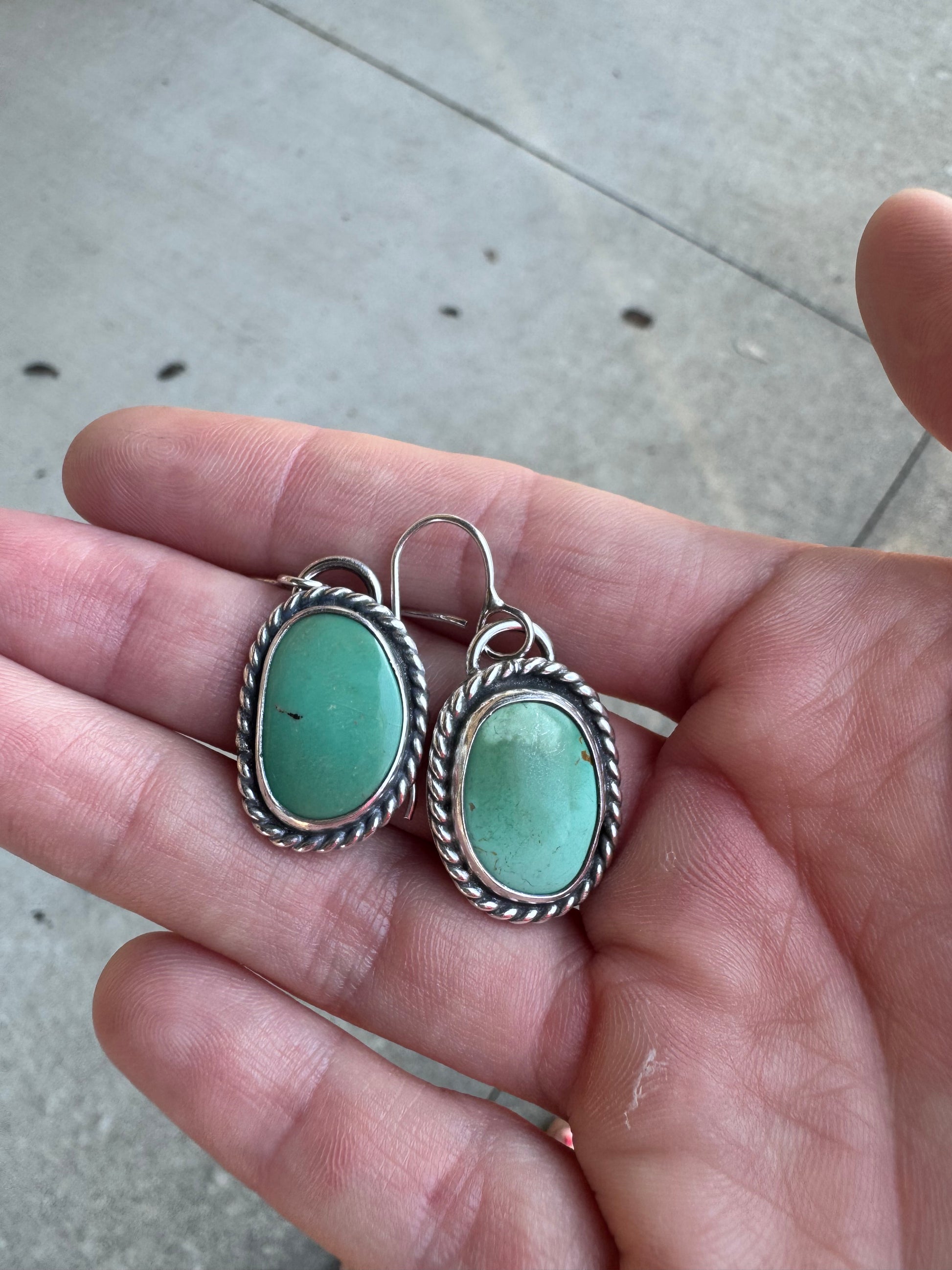 These Green Kings Manassa Turquoise Earrings are truly one of a kind. The stunning green color of the turquoise is enhanced by the rope detailing around the stones. Made of lightweight sterling silver, they are comfortable to wear all day long. Perfect for adding a touch of unique elegance to any outfit.