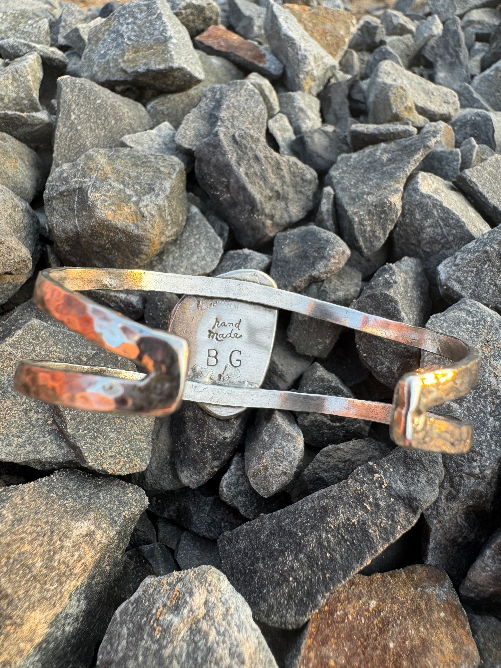 This Kingman turquoise cuff features a hammered finish and rope detail around a stunning stone with beautiful water webbing. The bright blue/green color adds a pop of color to any outfit. Handmade and made for a medium wrist size, this cuff is a unique addition to any collection.