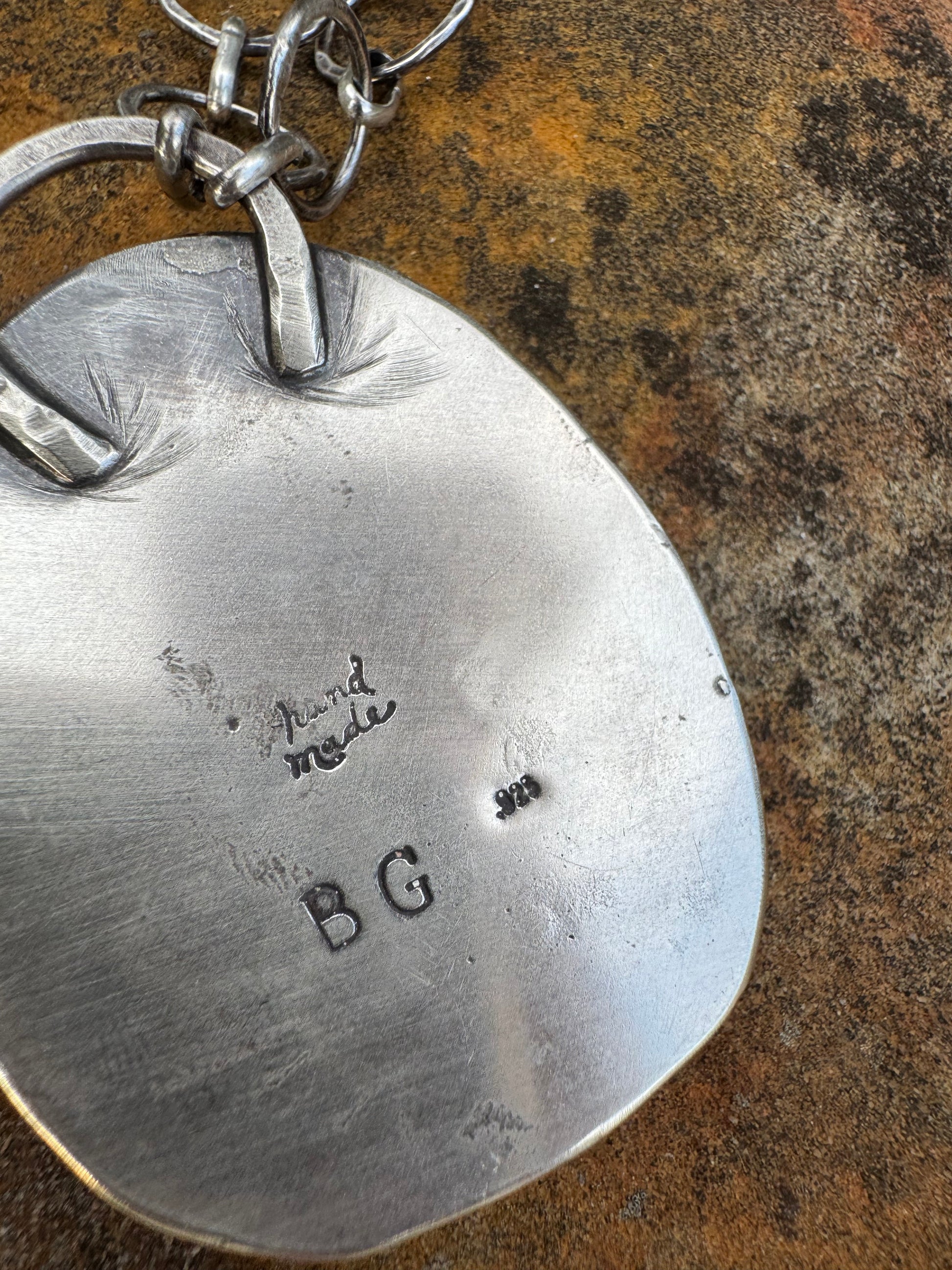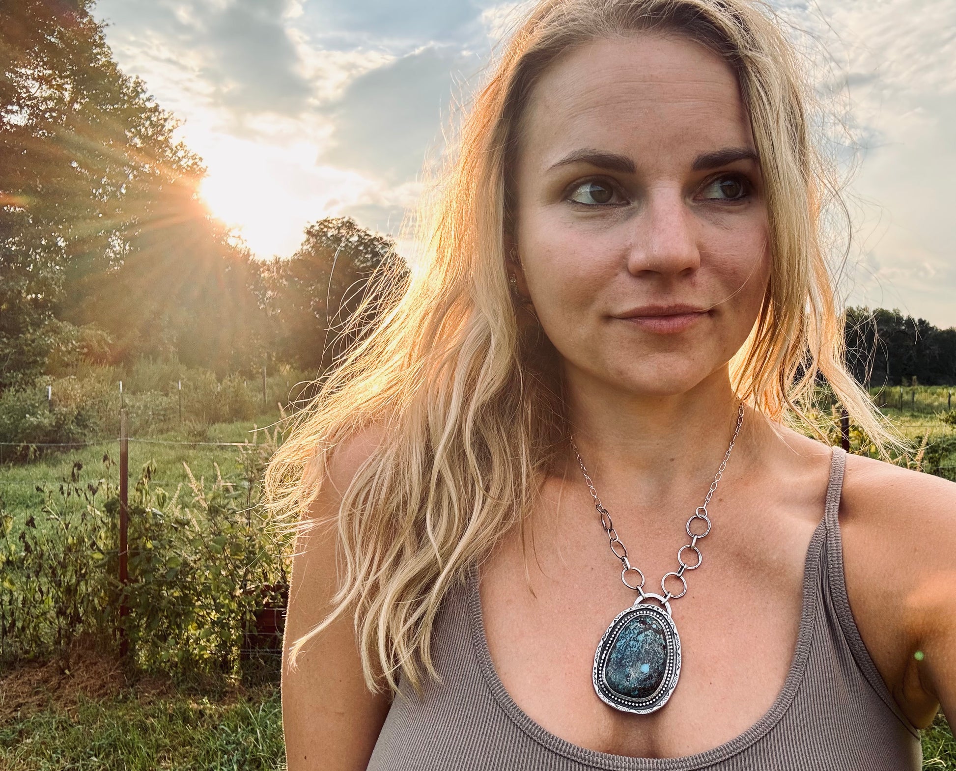 Luxurious high grade Kingman turquoise. Full of pyrite inclusions. Metallic gold throughout the stone. Unique matrix. 19 inches long. Sterling silver. Handmade hammered links. Stamped detail around stone. Indulge in the luxurious beauty of our Large High Grade Kingman Turquoise Necklace. The stunning turquoise is full of pyrite inclusions and boasts a unique metallic gold matrix. Measuring 19 inches in length, this necklace is crafted with handmade hammered links and detailed sterling silver. Elevate your style with this exquisite piece.
