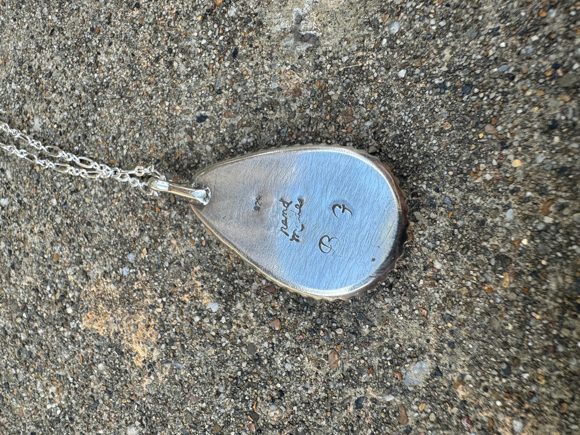 This necklace is a light blue piece of larimar. This gemstone is only found in the Dominican Republic. The colors are reminiscent of beautiful ocean waters. The chain is 20 inches. All sterling silver.