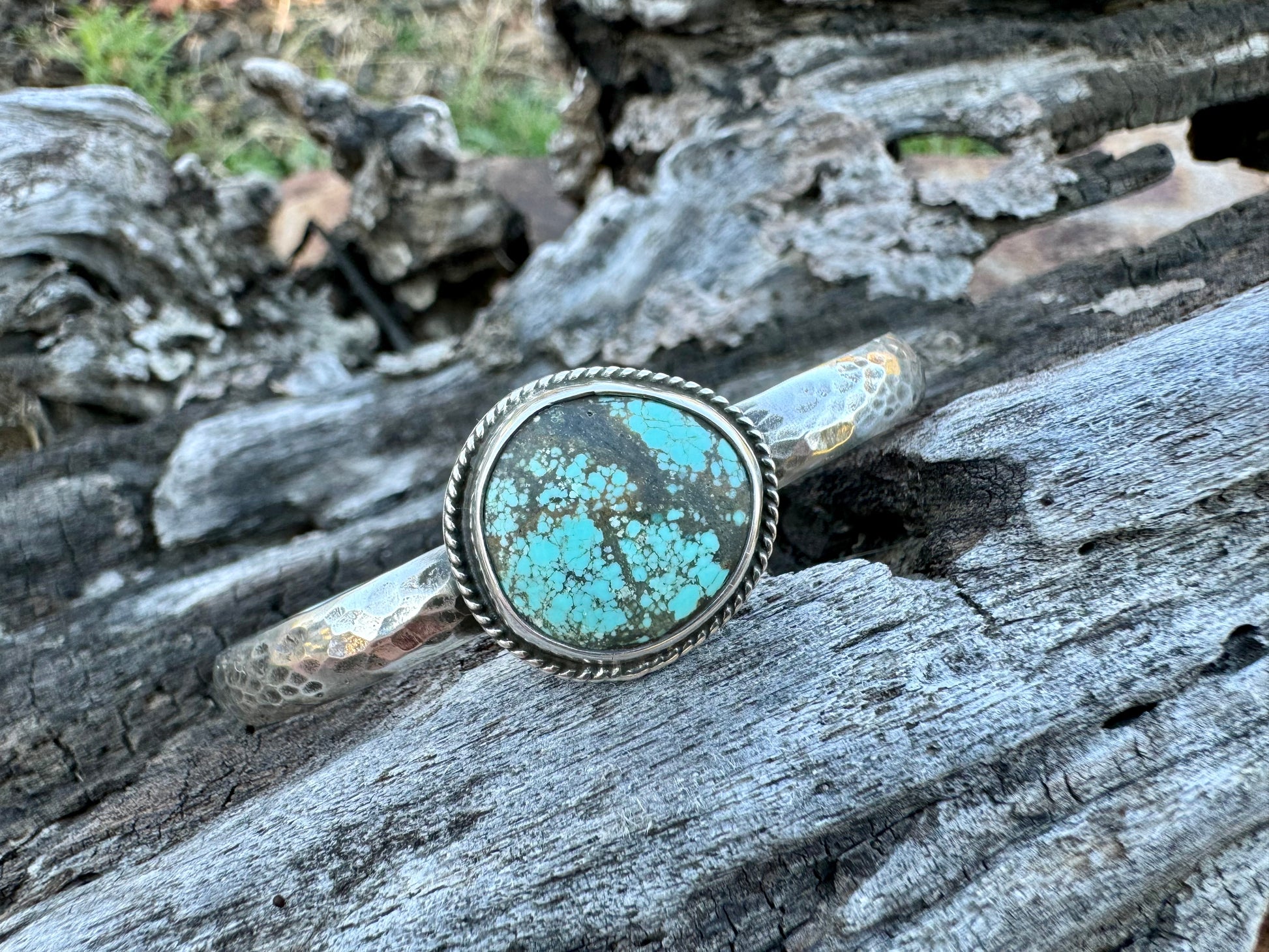 This bracelet is made for a medium to large sized wrist measuring approx 5.75 inches end to end with a 1 inch gap. It’s too big for my 6 inch wrist. It has a beautiful hammered finish and would be great for layering. The turquoise is from the Number Eight mine which is now closed. Solid sterling silver and one of a kind.