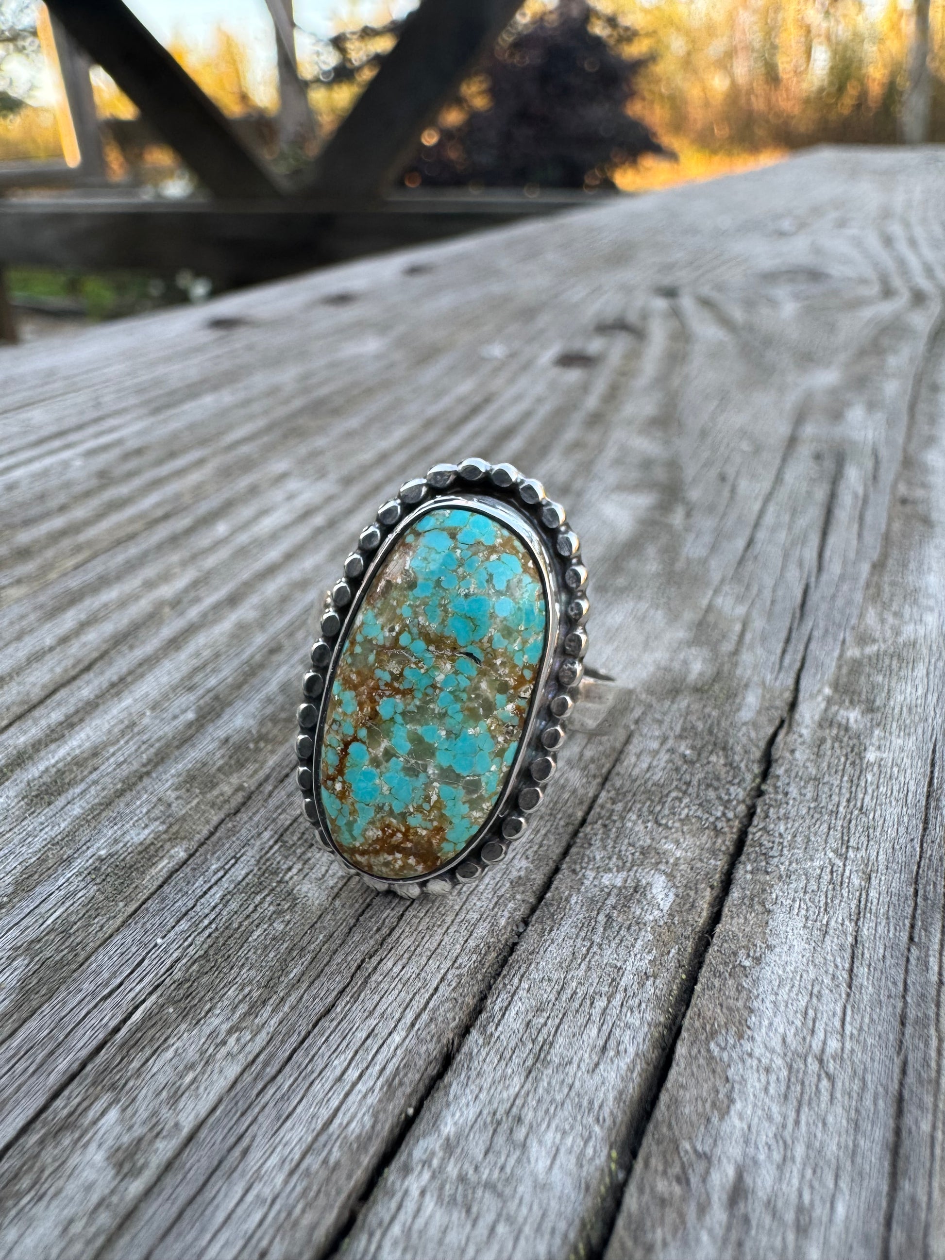 This rustic Number eight Turquoise ring in size 10 features a unique beaded wire detail and hammered finish. Made with high-quality materials, it adds a touch of elegance to any outfit. Expertly crafted, this ring showcases 100% genuine Number eight Turquoise, a rare and highly sought-after stone known for its distinctive patterns. Enjoy the benefits of wearing a one-of-a-kind piece of jewelry.