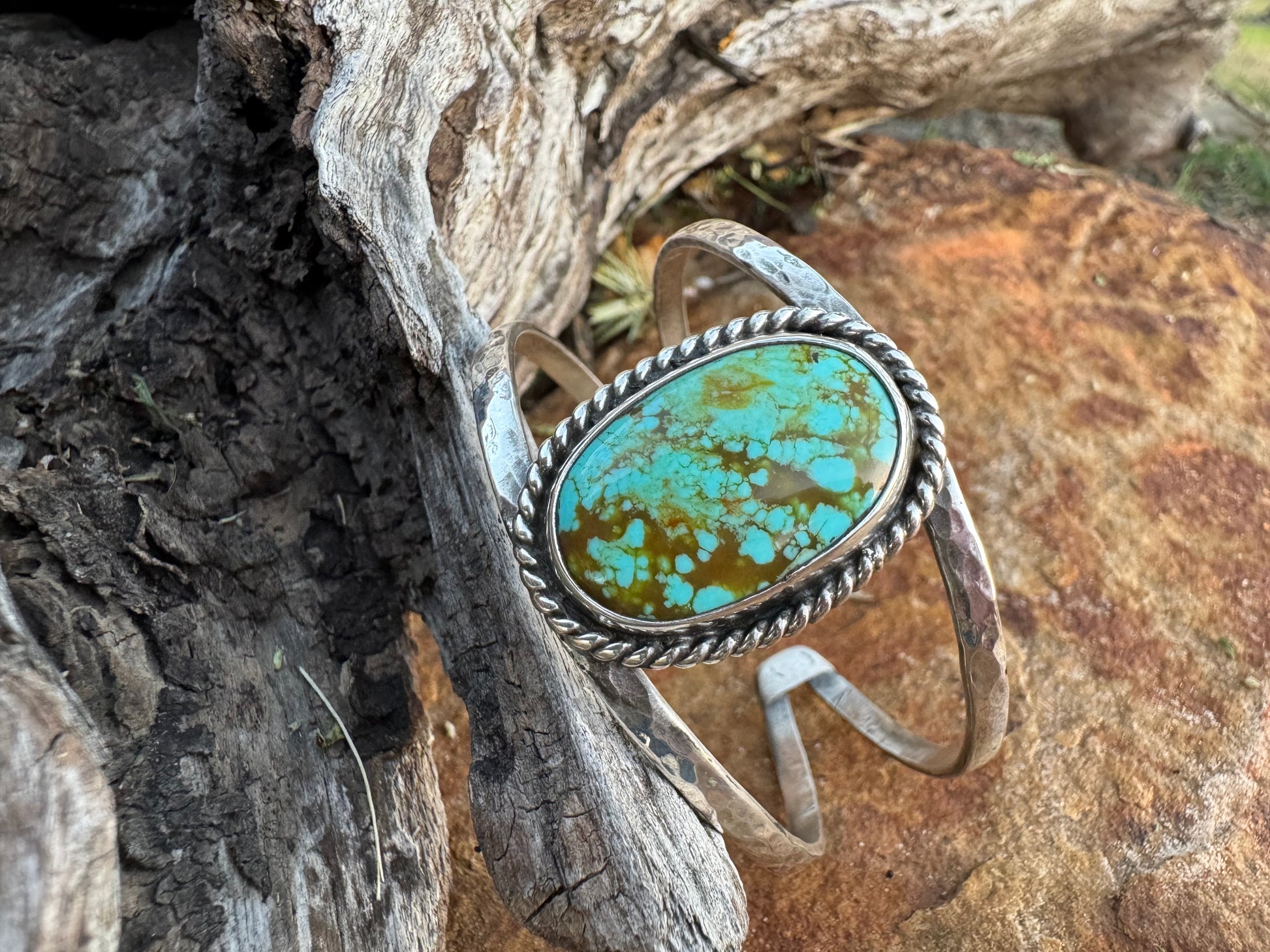 Experience the beauty of nature with our Oval Tyrone turquoise cuff bracelet. The unique twist wire detail showcases the stunning veining of the rare Tyrone turquoise, sourced from a closed mine. The hammered finish on the cuff adds a touch of elegance. Measuring 5.75 inches end to end, this piece is signed and stamped by me, Brandi Going.