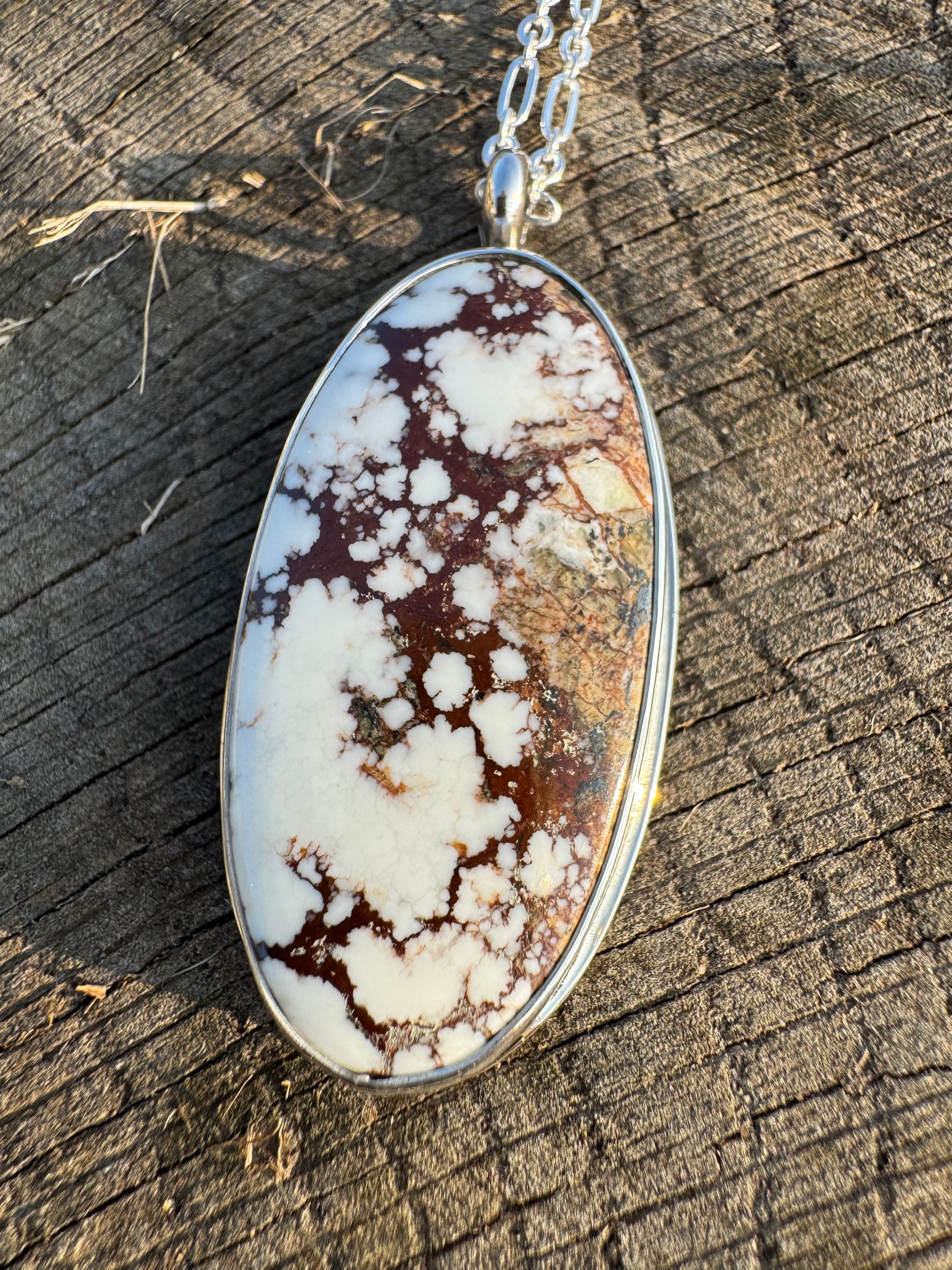 Expertly crafted with a simplistic setting, this Oval Wild Horse Magnesite Necklace boasts a unique and one-of-a-kind design. Made with sterling silver and a long 24 inch chain, this necklace adds an elegant touch to any outfit. Elevate your style with this stunning piece.