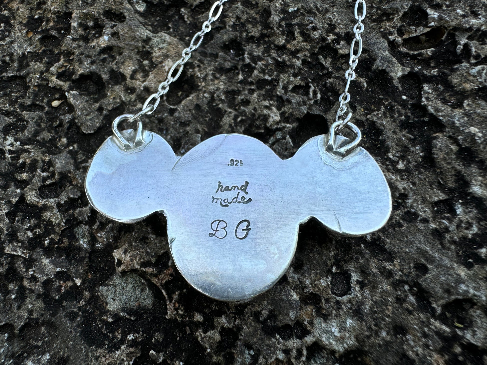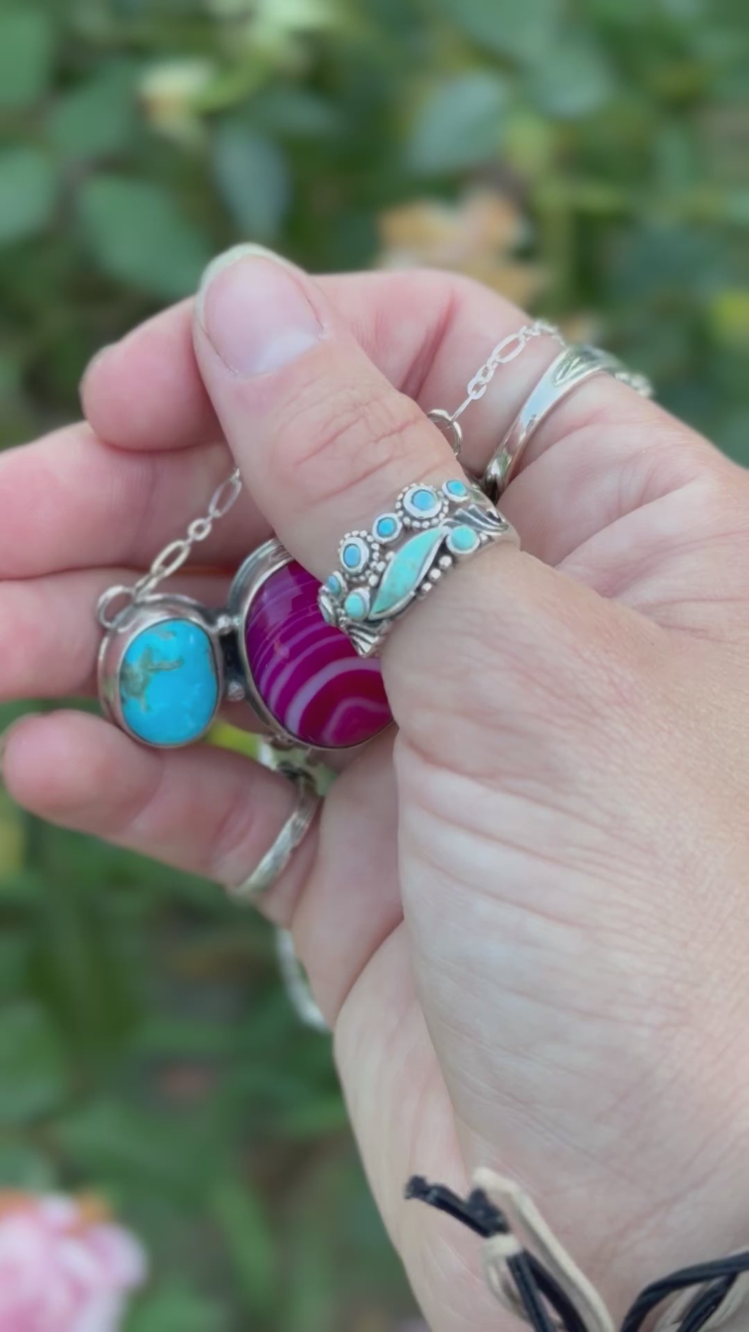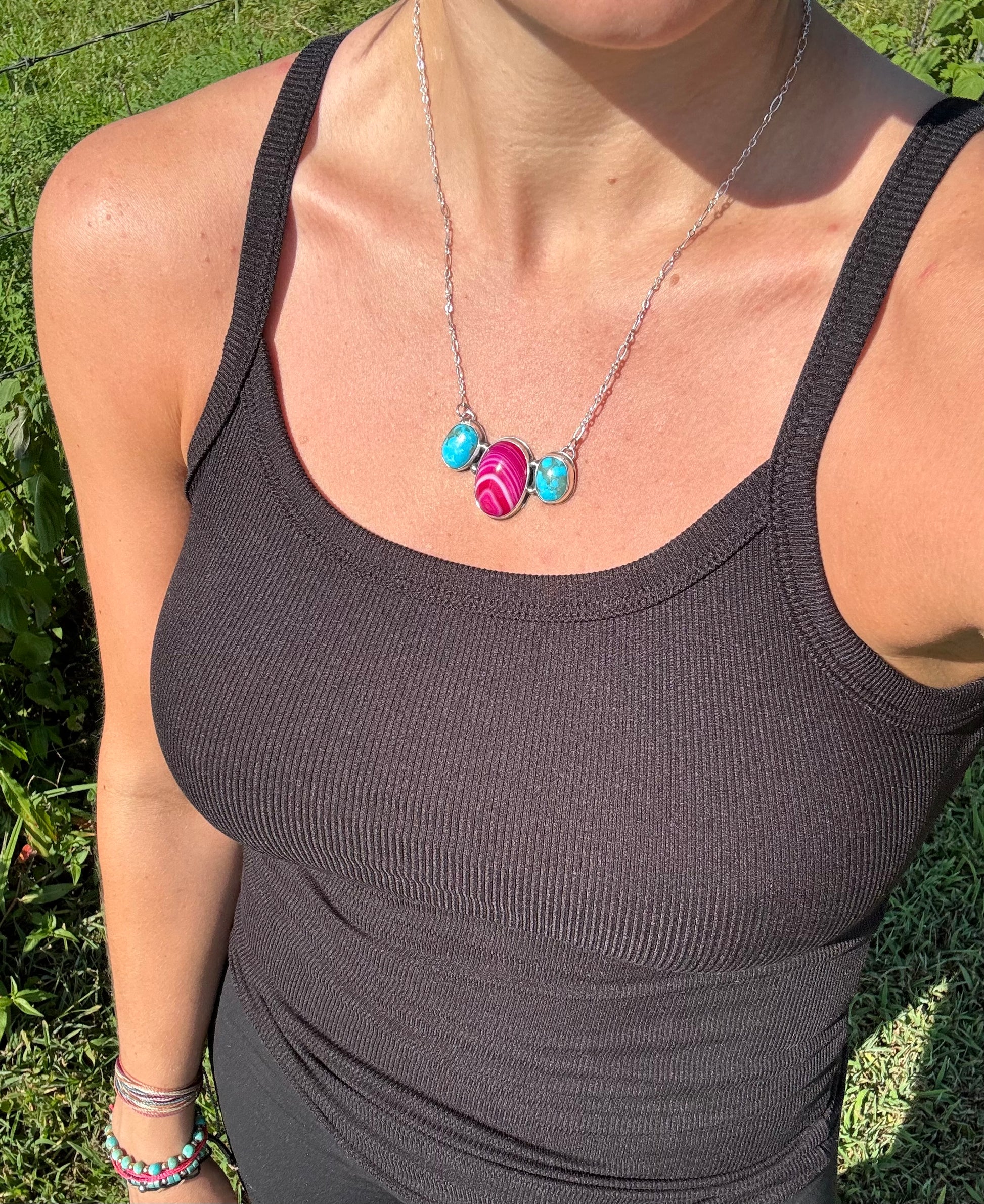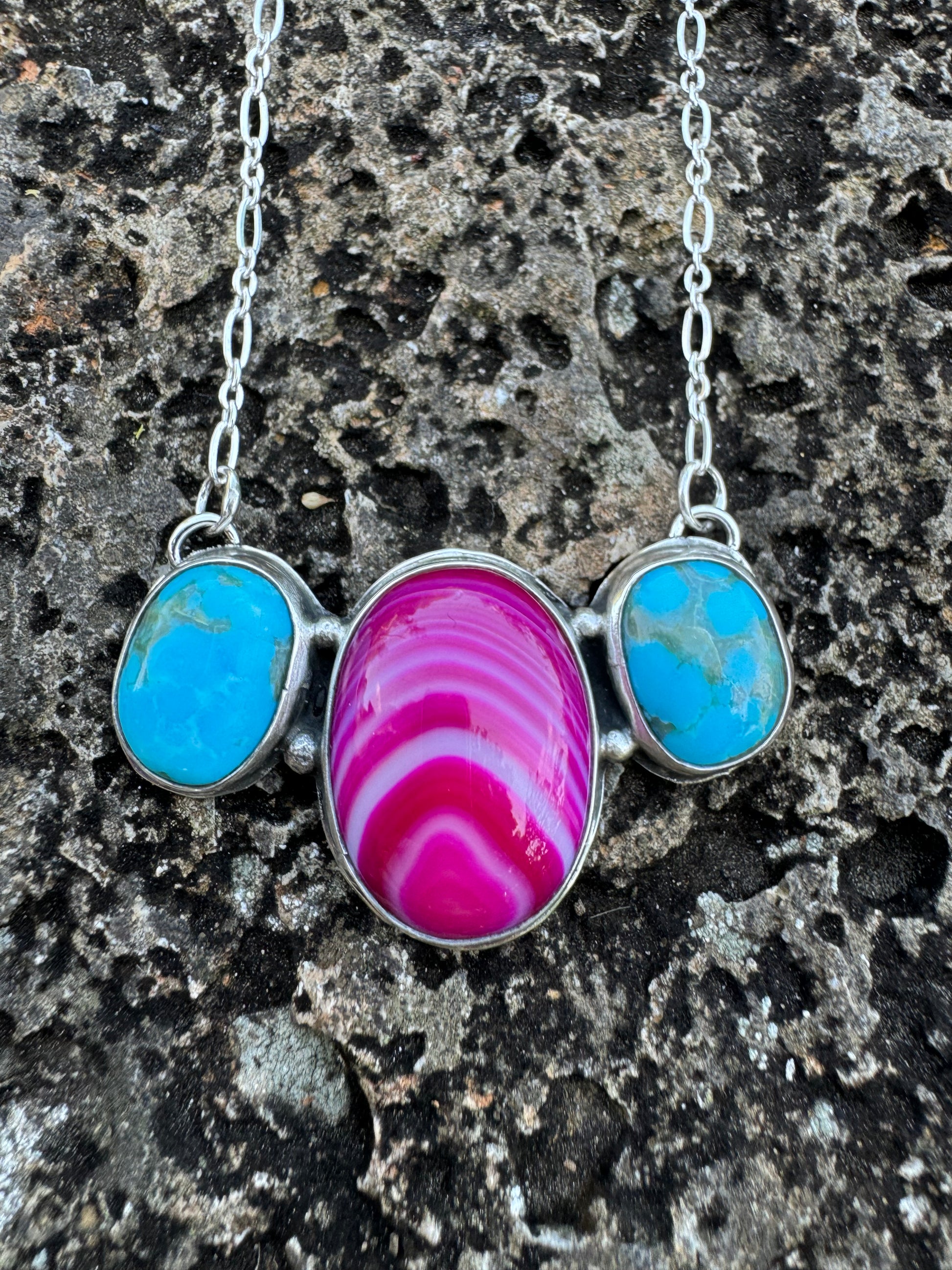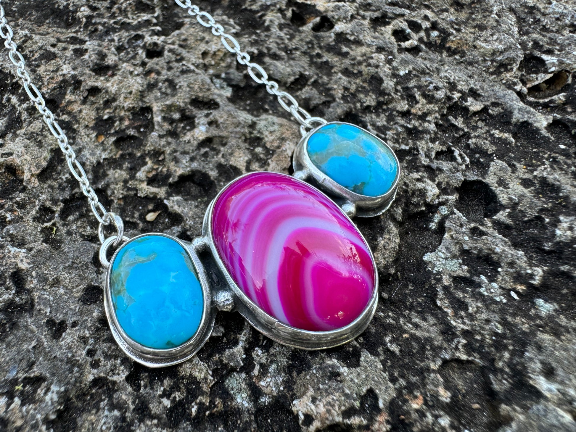 This piece is the perfect summer time accessory! The pink banded agate in this one reminds me of the bands in a tree. The turquoise is bright blue Kingman. This simple setting is made to let the stones shine on their own. Not too heavy and perfect for layering . The chain is sterling silver and the overall length is approx 18.5 inches.