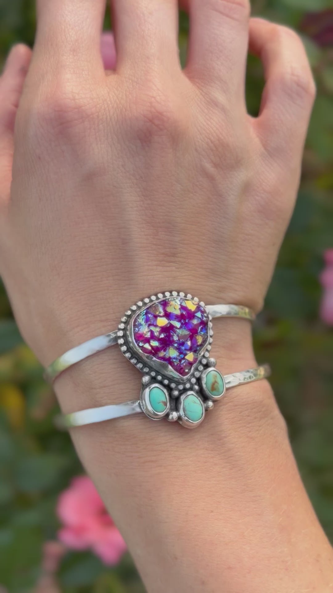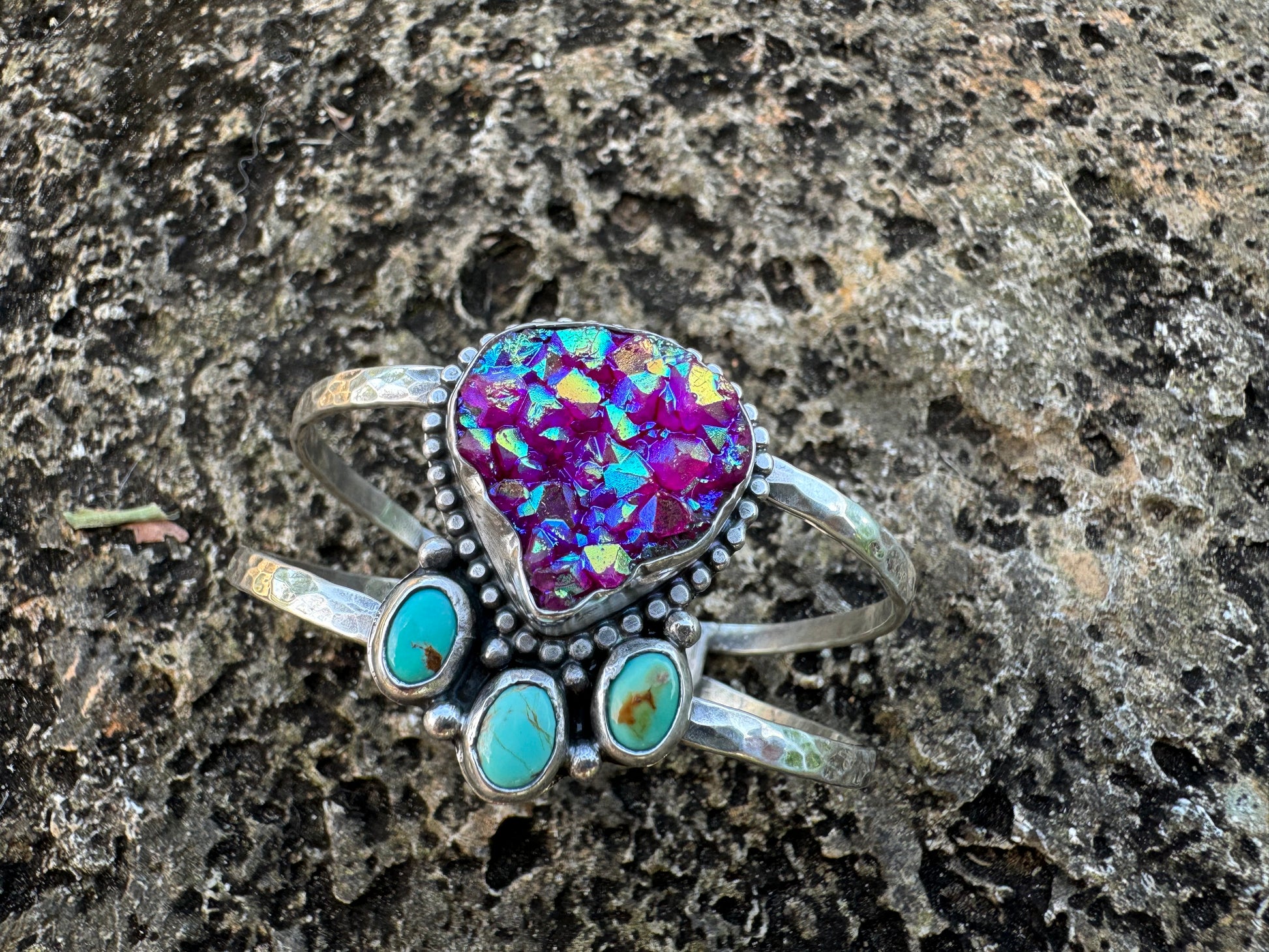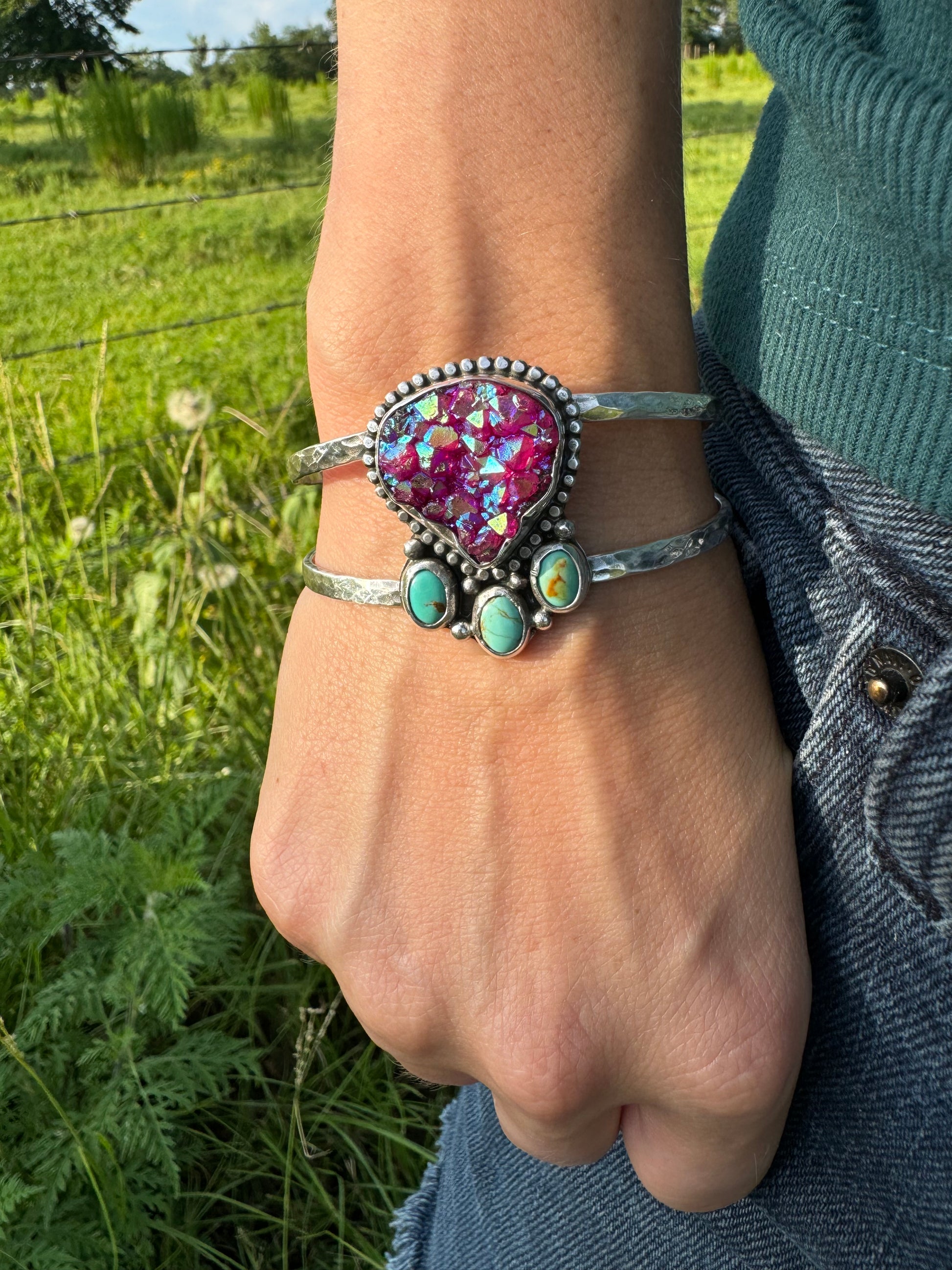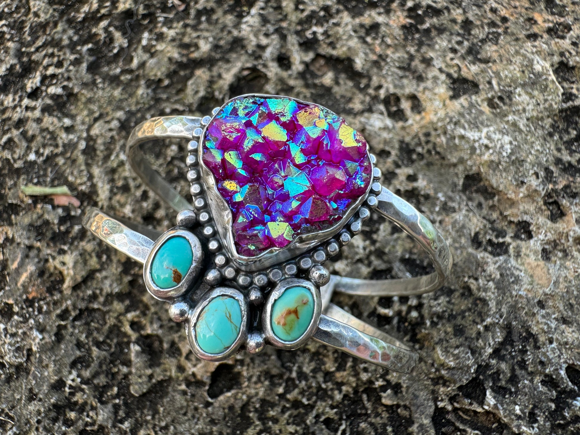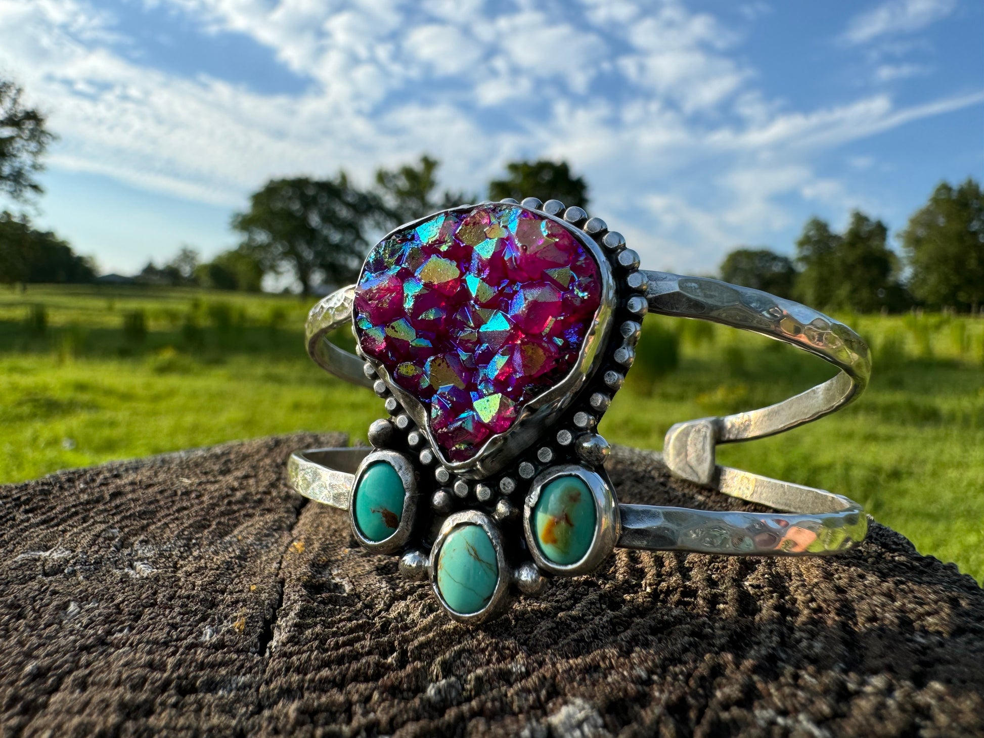 I wanted to make something a little different and I think I’ve accomplished that 😂. This is made with pink agate druse that has been heat treated to get this beautiful iridescent finish. The turquoise is from the Kingman mine. The cuff is somewhat flexible and can be adjusted to a comfortable fit for your wrist. The length is 5.5 inches end to end. As it’s fitted now it has a 1 inch gap. It fits a 6 to 7 inch wrist comfortably.