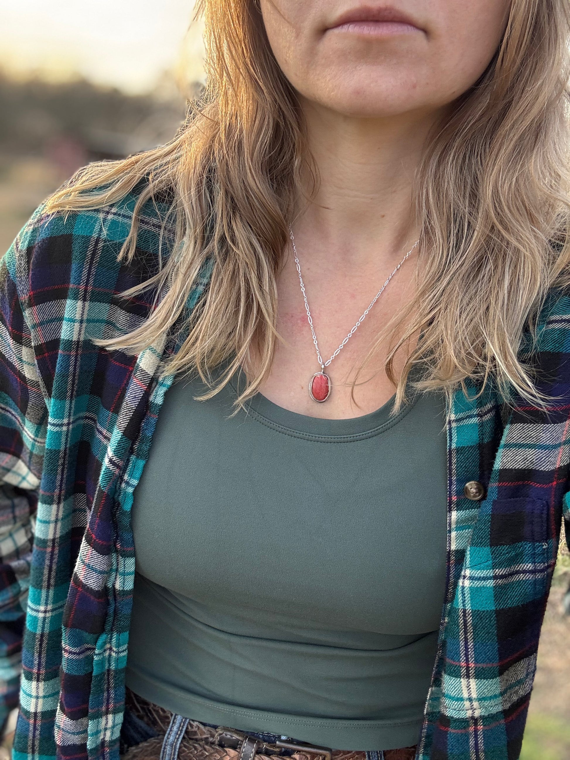 The Red Spiny Oyster Little Pendant features a 20-inch sterling silver chain and a minimalist design, emphasizing the unique properties of the gemstone. Each piece is one of a kind, ensuring that no two pendants are alike, reflecting a commitment to individuality and craftsmanship.