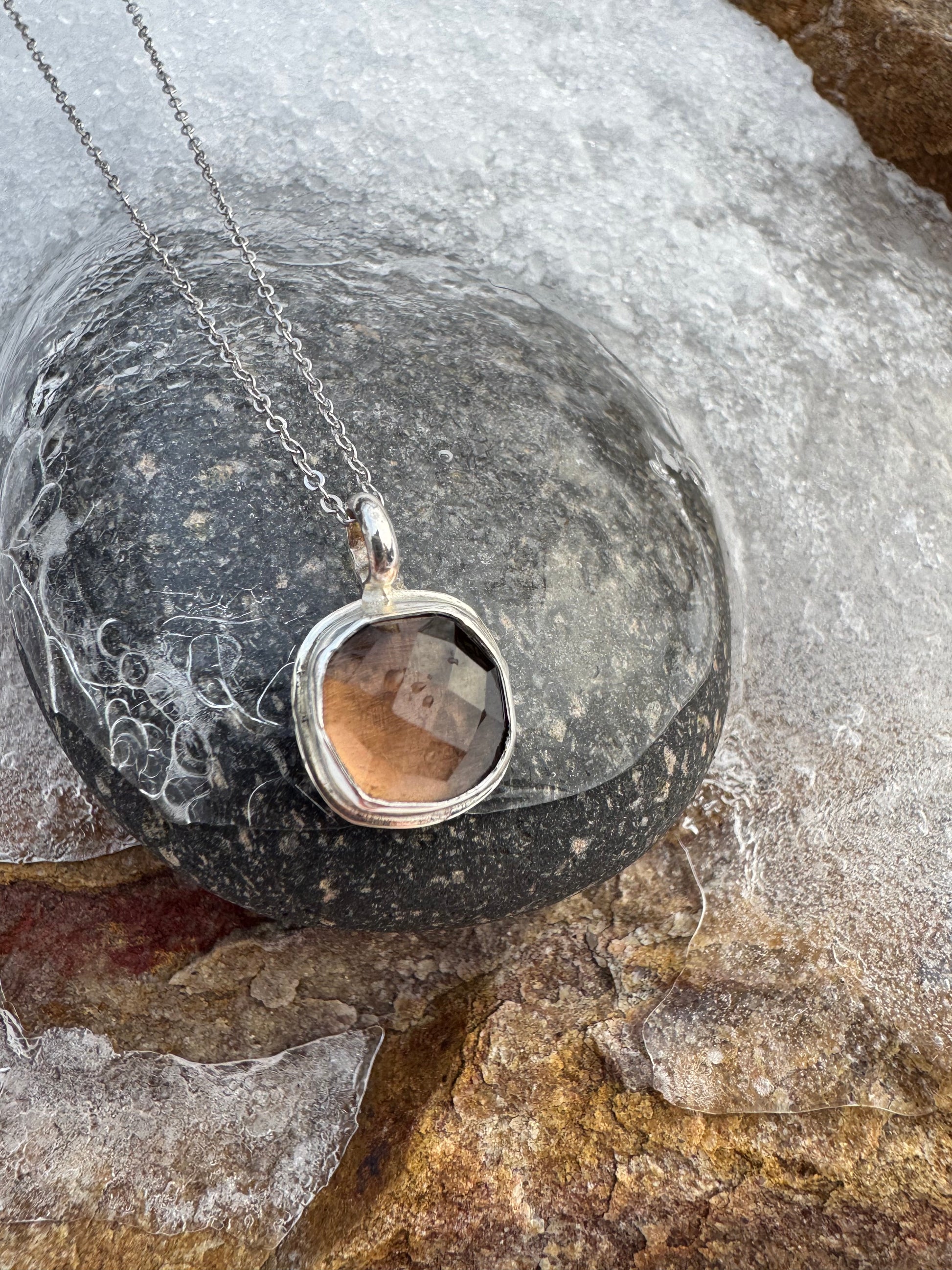 The Smoky Quartz Dainty Pendant features a cushion-cut, faceted smokey quartz stone, expertly set in sterling silver. The 16-inch chain ensures a comfortable fit, making it suitable for daily wear. Smokey quartz is known for its grounding properties, potentially enhancing emotional stability and clarity.