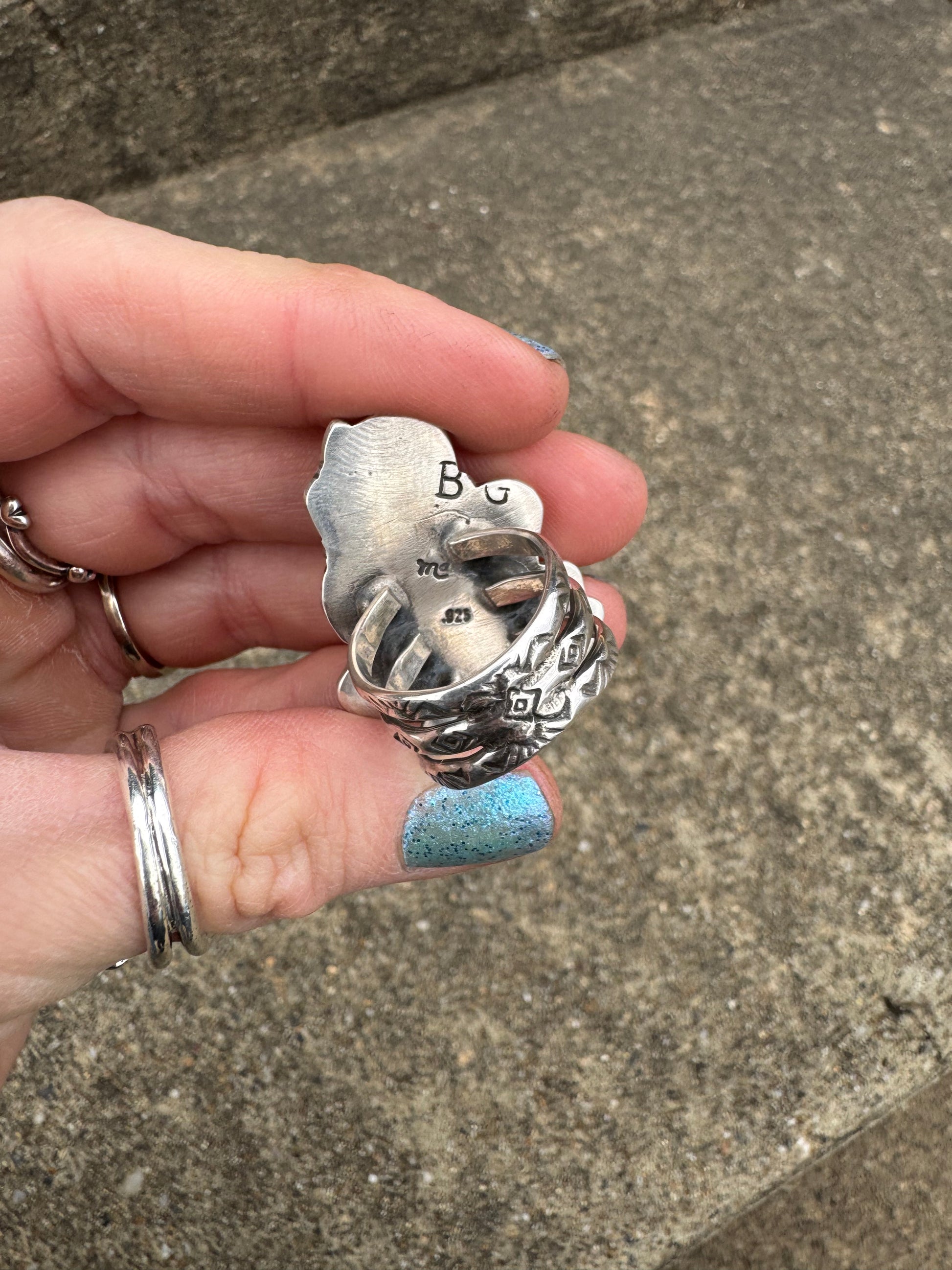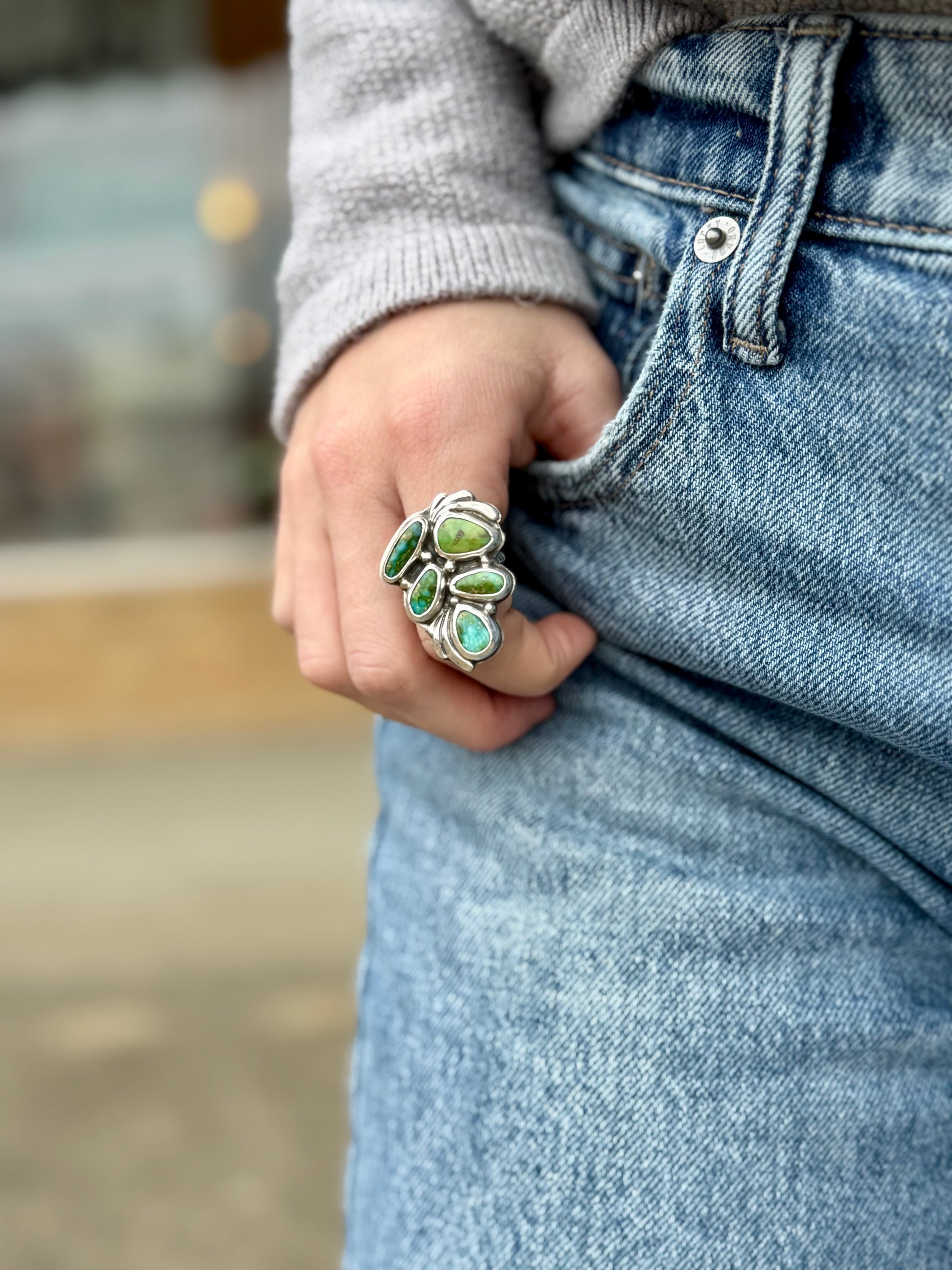 "Embrace the beauty of nature with our Sonoran Gold Cluster ring in size 6.5. Handcrafted with all sterling silver, this one-of-a-kind ring features gorgeous Sonoran gold turquoise in a stunning cluster design. The wider band, hand stamped with an original, unique pattern, adds a touch of elegance to this nature-inspired piece.