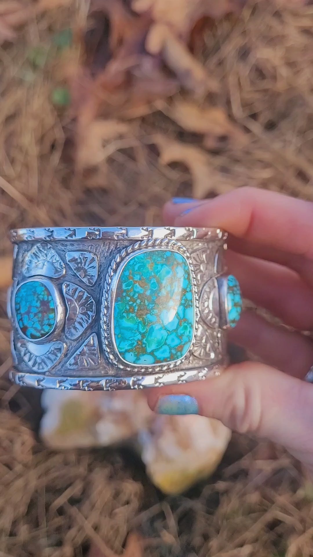 This cuff is made with some of the most beautiful turquoise I've ever seen. It is red Spiderweb polychrome Kingman turquoise. It's a high grade type of Kingman turquoise that is very valuable. The bracelet is all handmade by me. I used my handmade Navajo design stamps that I bought while in Arizona. I cut out each stamp and over layed it on the cuff. It's a very heavy weight piece measuring 1.5 inches wide and 5.75 inches long with a 1.25 inch gap. This piece is made for a medium to large sized wrist.