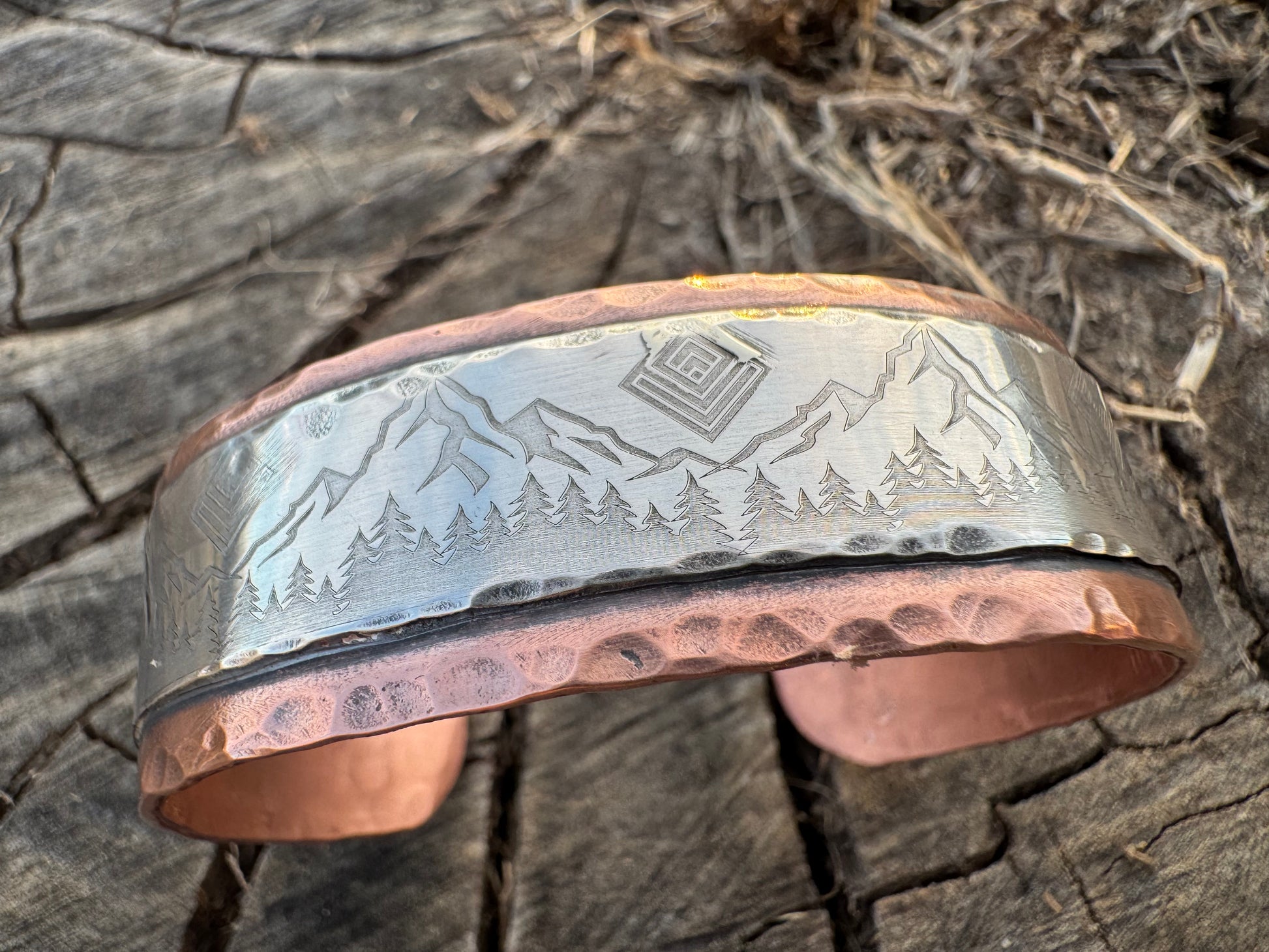 Sterling silver and Copper Mountain scene Cuff Bracelet