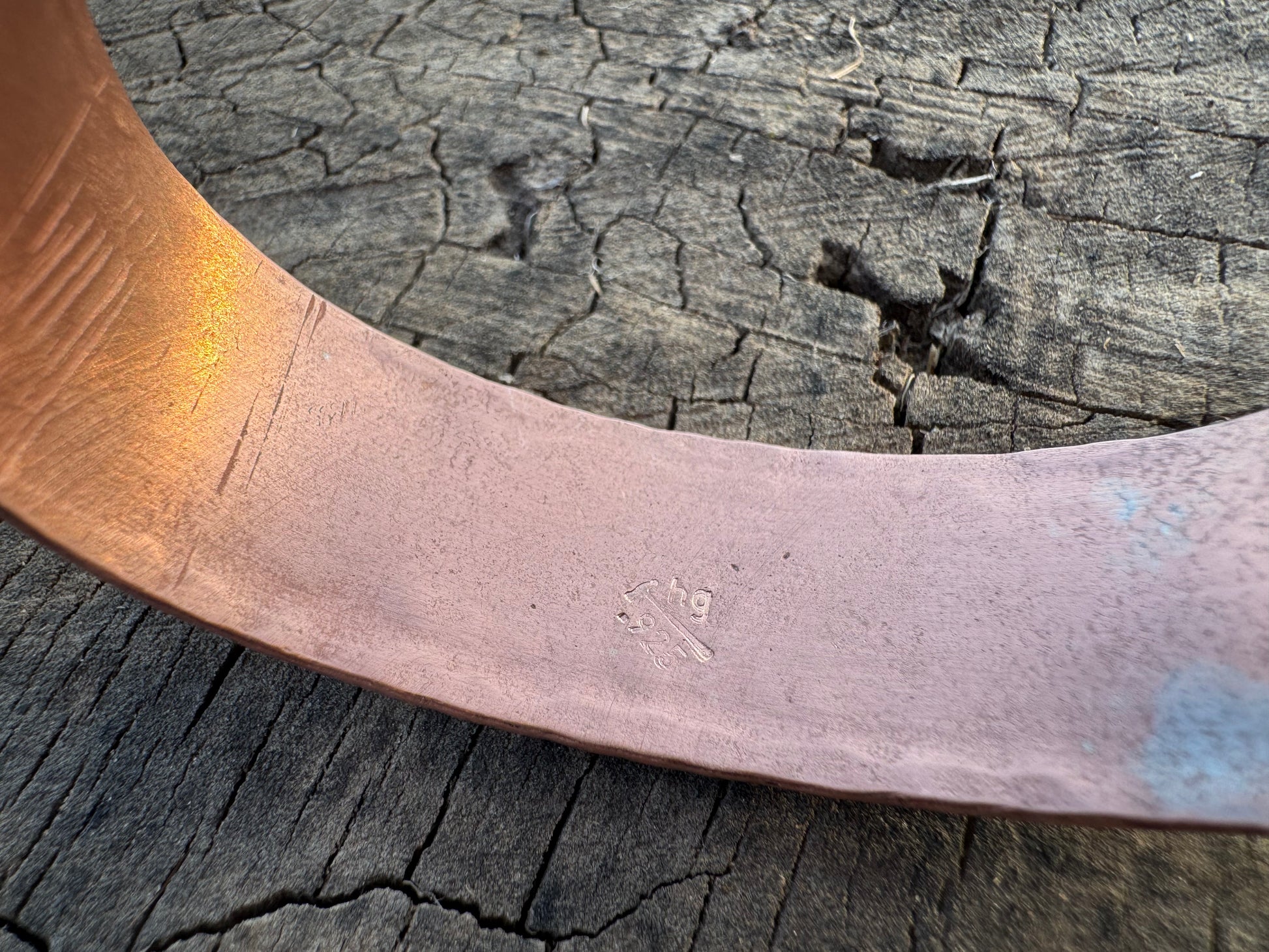 This one-of-a-kind cuff bracelet features a heavy gauge copper construction, providing potential benefits such as improved circulation and reduced inflammation associated with copper wear. The thick sterling silver detail and intricately engraved mountain and forest scene offer durability and aesthetic appeal. Measuring 6 inches long, it combines functionality with artistic craftsmanship by Brandi.