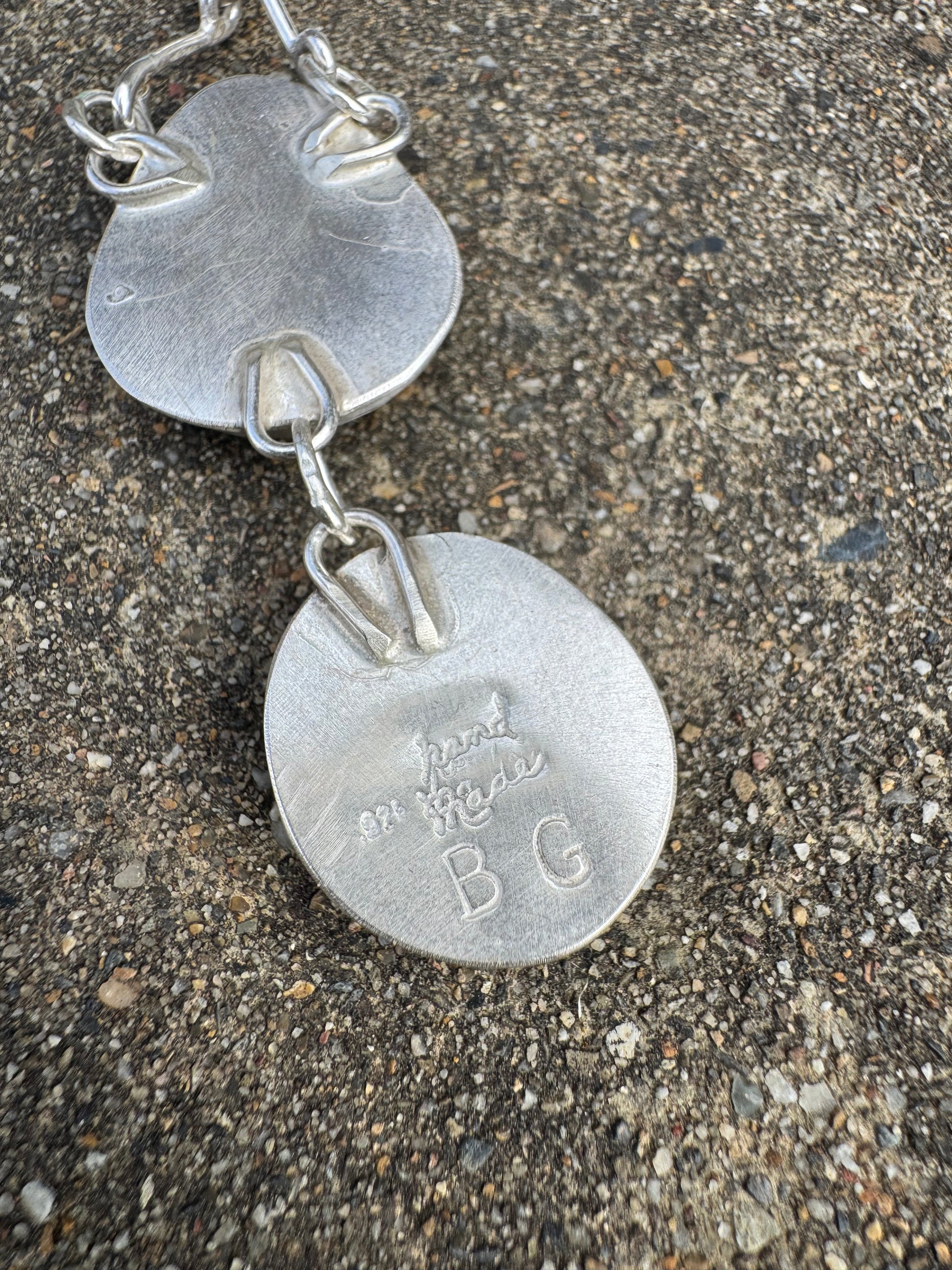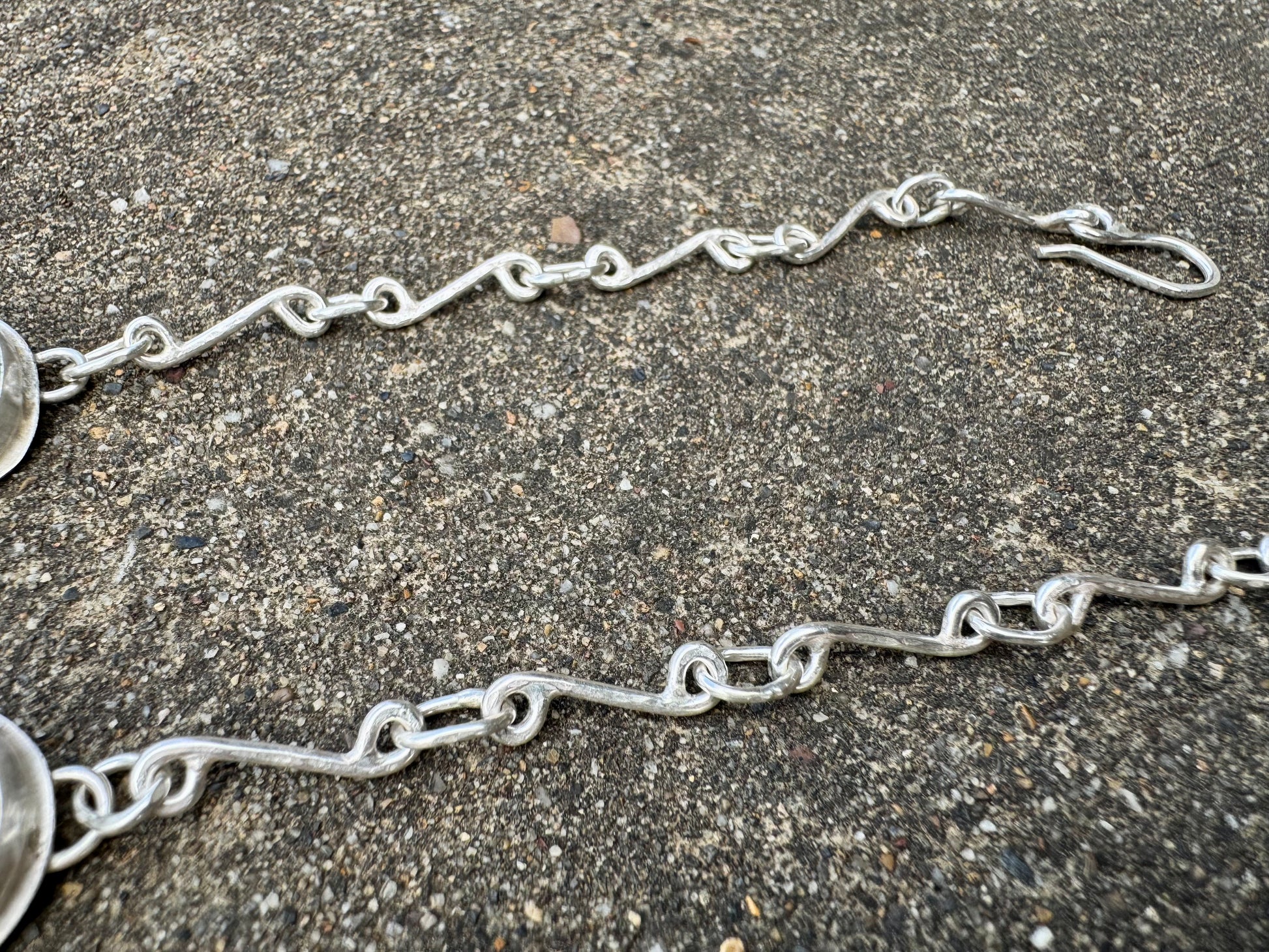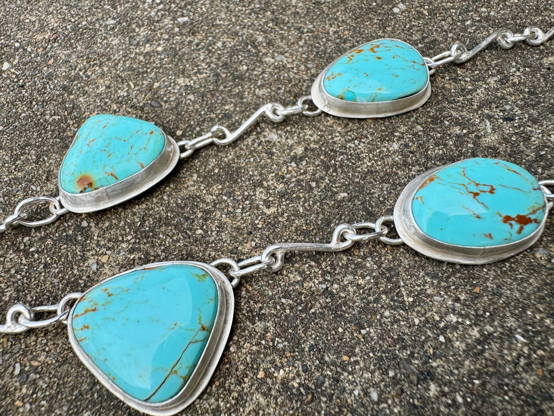 The Tyrone Turquoise Statement necklace boasts rare, vibrant turquoise stones from the Tyrone mine in New Mexico. Each stone is set in a simplistic sterling silver design, complemented by a handmade chain. With a bold, bright blue hue and measuring at 18 inches, this necklace is a must-have for any sophisticated jewelry collection.